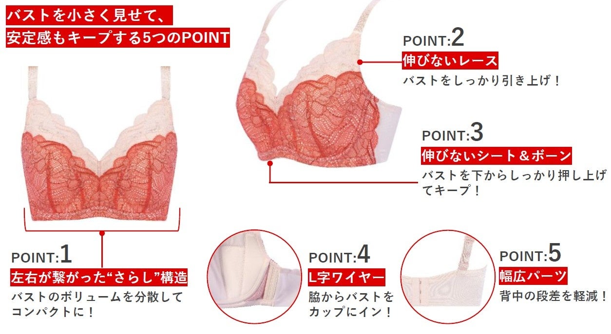 左右つながった“さらし”のような構造でバストのボリュームを分散し、コンパクトに整える独自パターンを採用。カップ上辺&前中心の下辺の伸びない素材で、豊かなバストをすっきり整えます。さらにL字のワイヤーが脇からバストをカップに収め、背中は幅広パーツで段差を軽減します。