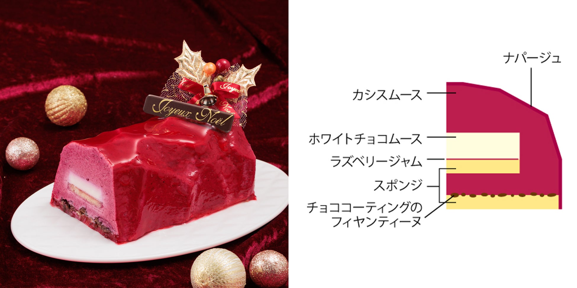カシスムースで包まれた真っ赤なノエル。中にはホワイトチョコムースとスポンジが層になっており、その間に自家製の甘酸っぱいラズベリージャムをサンド。底にはチョコでコーティングしたフィヤンティーヌが食感のアクセントとなり、風味に深みを加えています。見た目も味わいもクリスマスにぴったりな、特別なひとときを演出するナパージュのツヤが美しいケーキです。
