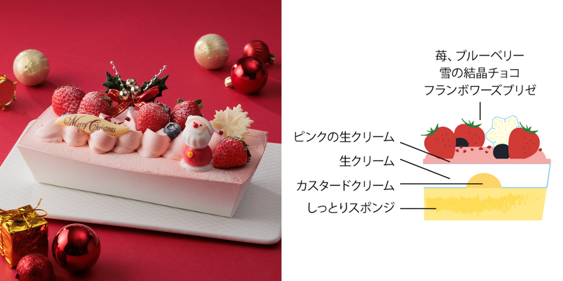 今年のクリスマスは13種類のケーキをご用意しました。アルコール不使用なので安心してご家族みんなで楽しめるクリスマスケーキです。甘酸っぱい苺と生クリームが調和した王道のクリスマスケーキや、サンタクロースやスノーマンがキャラクターになったケーキなど、さまざまなラインナップが登場します。