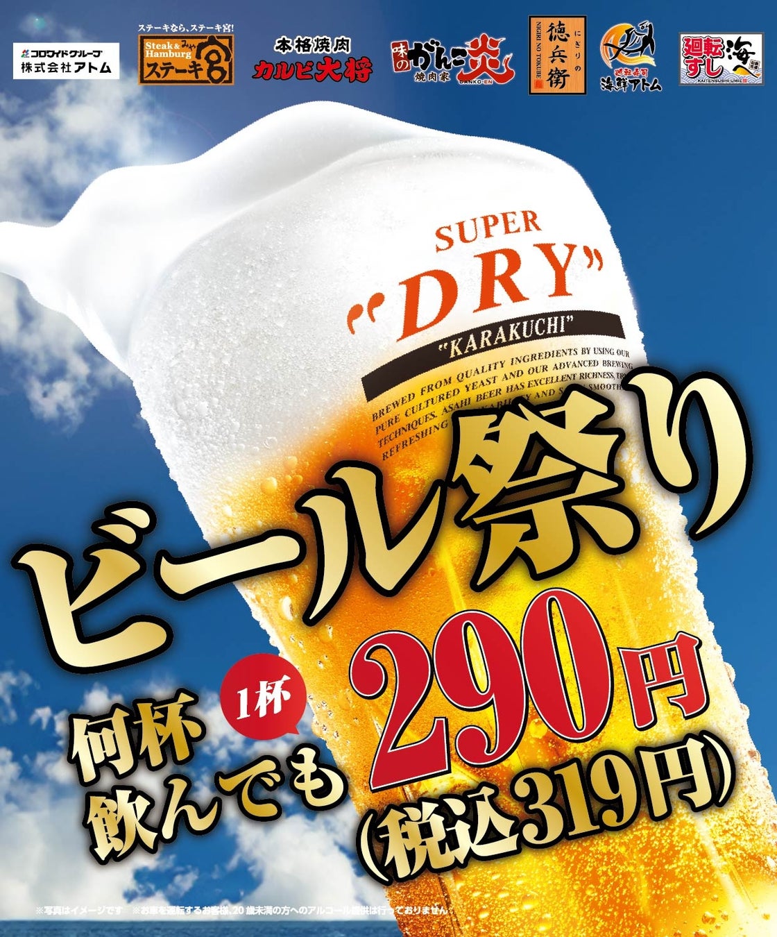 今年もビールがうまい季節がやってきた!アトムの6ブランドで【ビール祭り】開催!ステーキ宮・カルビ大将・味のがんこ炎・にぎりの徳兵衛など計225店舗で生ビール1杯290円(税込319円)!