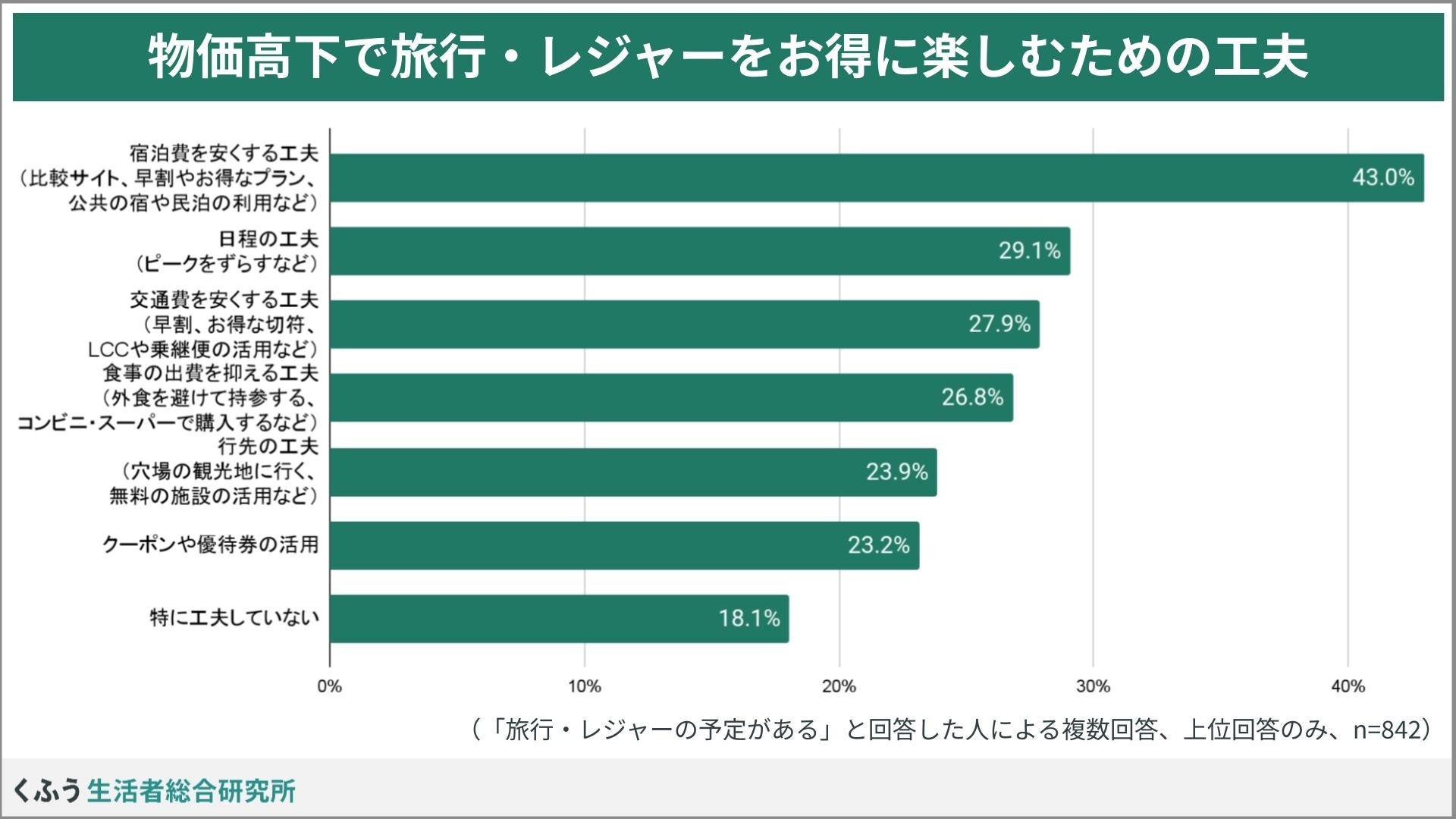 お得にゴールデンウィークの旅行・レジャーを楽しむ工夫としては「宿泊費を安くする工夫」(43.0%)が最多で、多くの人が早割の活用、民泊など格安宿の利用、宿泊プランの工夫などを挙げました。目立ったのは「ホテルではなくキャンプで宿泊費を抑える」という声で、コロナ禍で人気を集めたキャンプが"宿泊費を抑えてお得に楽しむ手段"として再び注目されていることもわかりました。