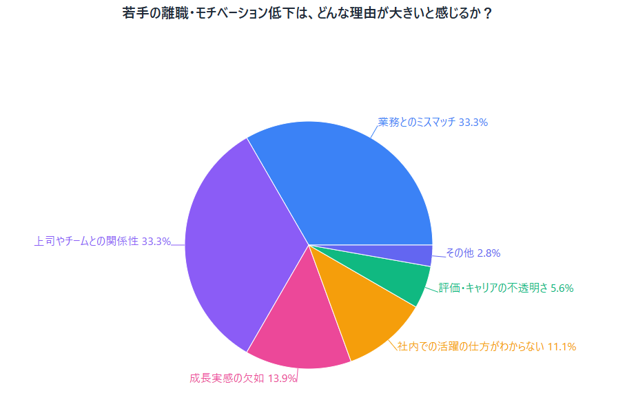 これは、「若手の離職・モチベーション低下の理由」として「上司やチームとの関係性」(33.3%)が「業務とのミスマッチ」(33.3%)と並んでトップであることと深く関連していると考えられます。