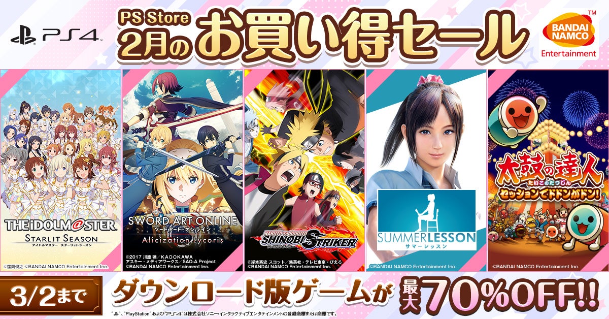 『2月のお買い得セール!』開催!「アイドルマスター スターリットシーズン」や「太鼓の達人 セッションでドドンがドン!」等プレイステーションのDL版ゲームが最大70%OFF!