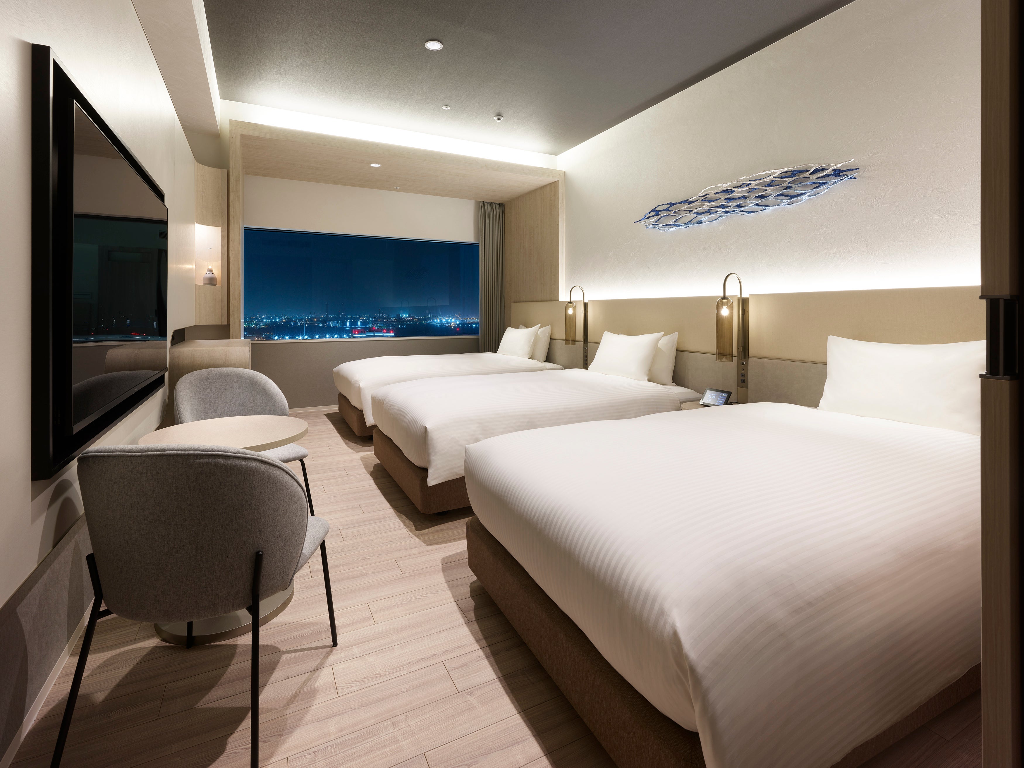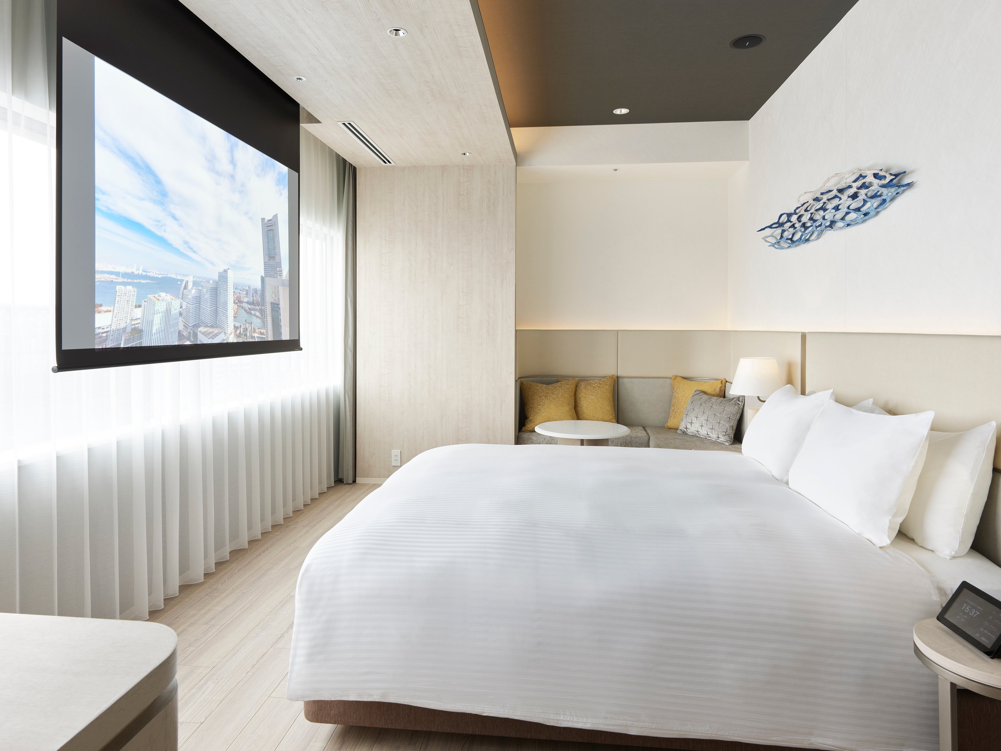また、全室のテレビにキャスティング・ミラーリングの機能があり、大画面でインターネットのコンテンツを楽しめるほか、プロジェクター付きの客室以外の客室にソニーのグラスサウンドスピーカーを設置し、夜景を眺めながら音楽とのひと時をお過ごしいただけます。