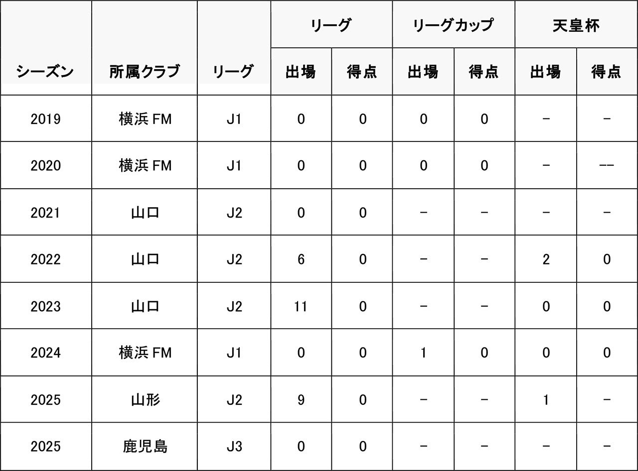 JFC FUTURO – 横浜F・マリノスジュニアユース – 横浜F・マリノスユース – 横浜F・マリノス – レノファ山口FC – 横浜F・マリノス – モンテディオ山形 – 鹿児島ユナイテッドFC