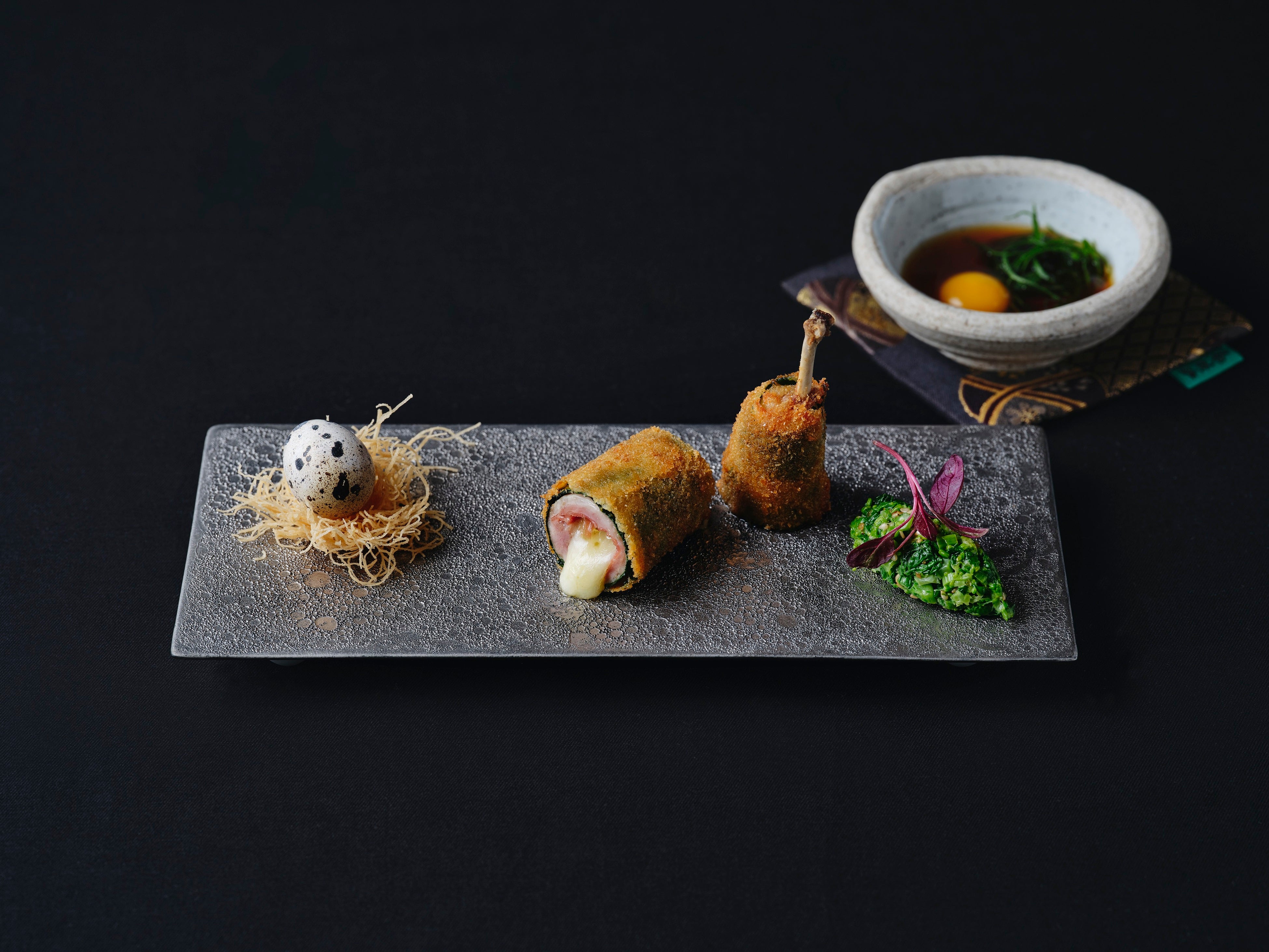 柔らかい肉質のフランス産鶉に生ハムとグリュイエール チーズを巻き、丁寧に揚げ焼きした一品。鶉の卵を溶いたタレに絡めてお召し上がりください。
