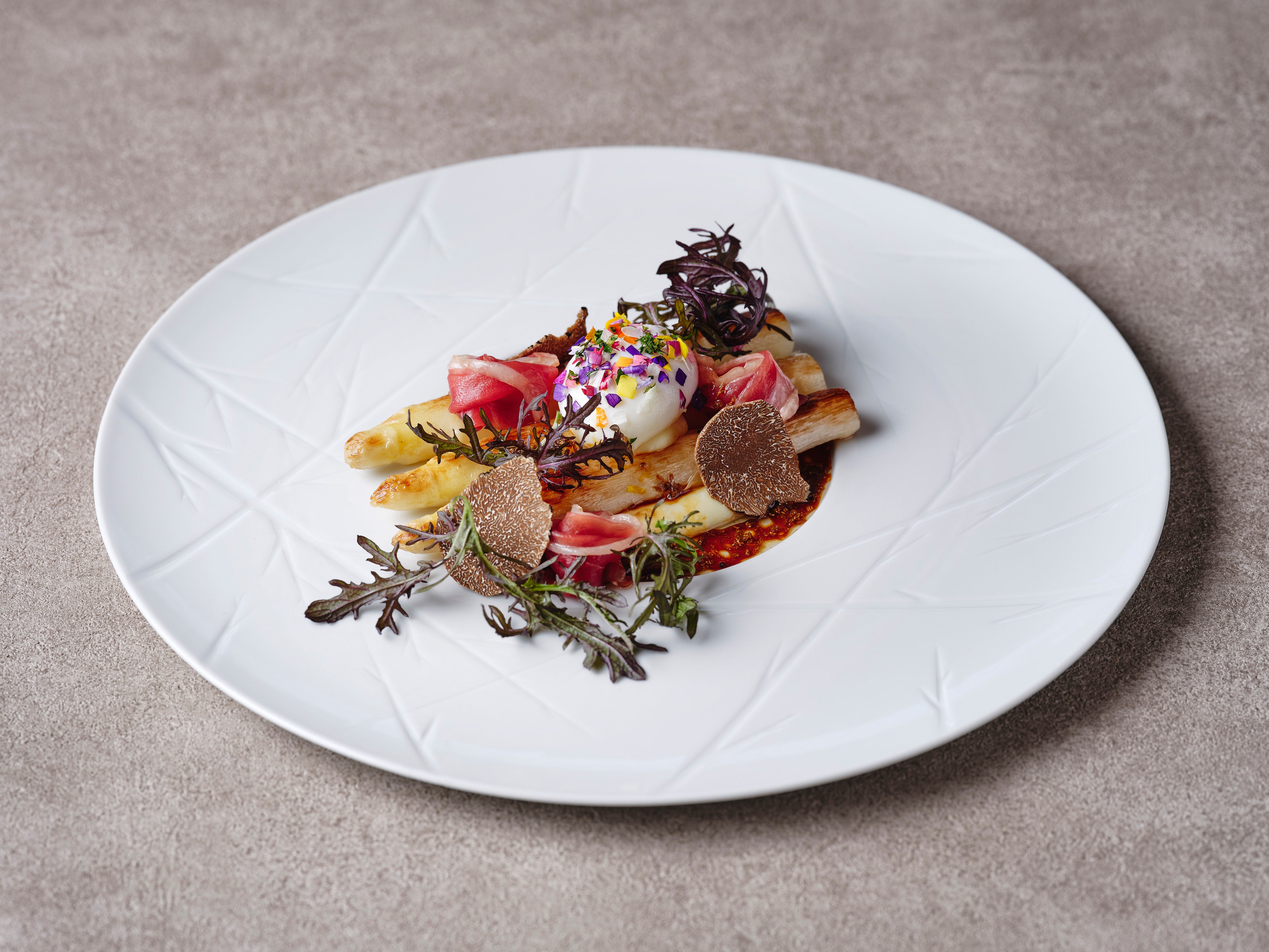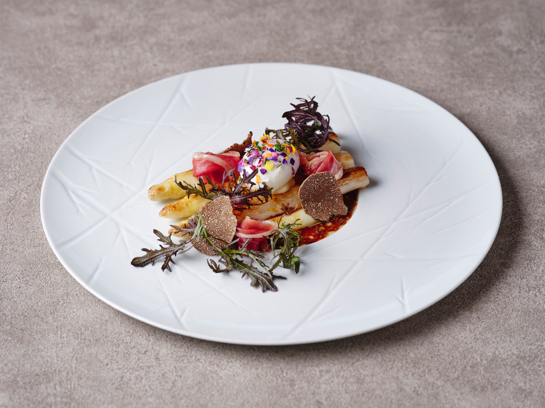 野性味溢れるフランス産ホワイトアスパラガスに、燻製により旨味を濃縮させた京鴨の生ハムをあわせた前菜。トリュフのソースを絡めてお召し上がりください。