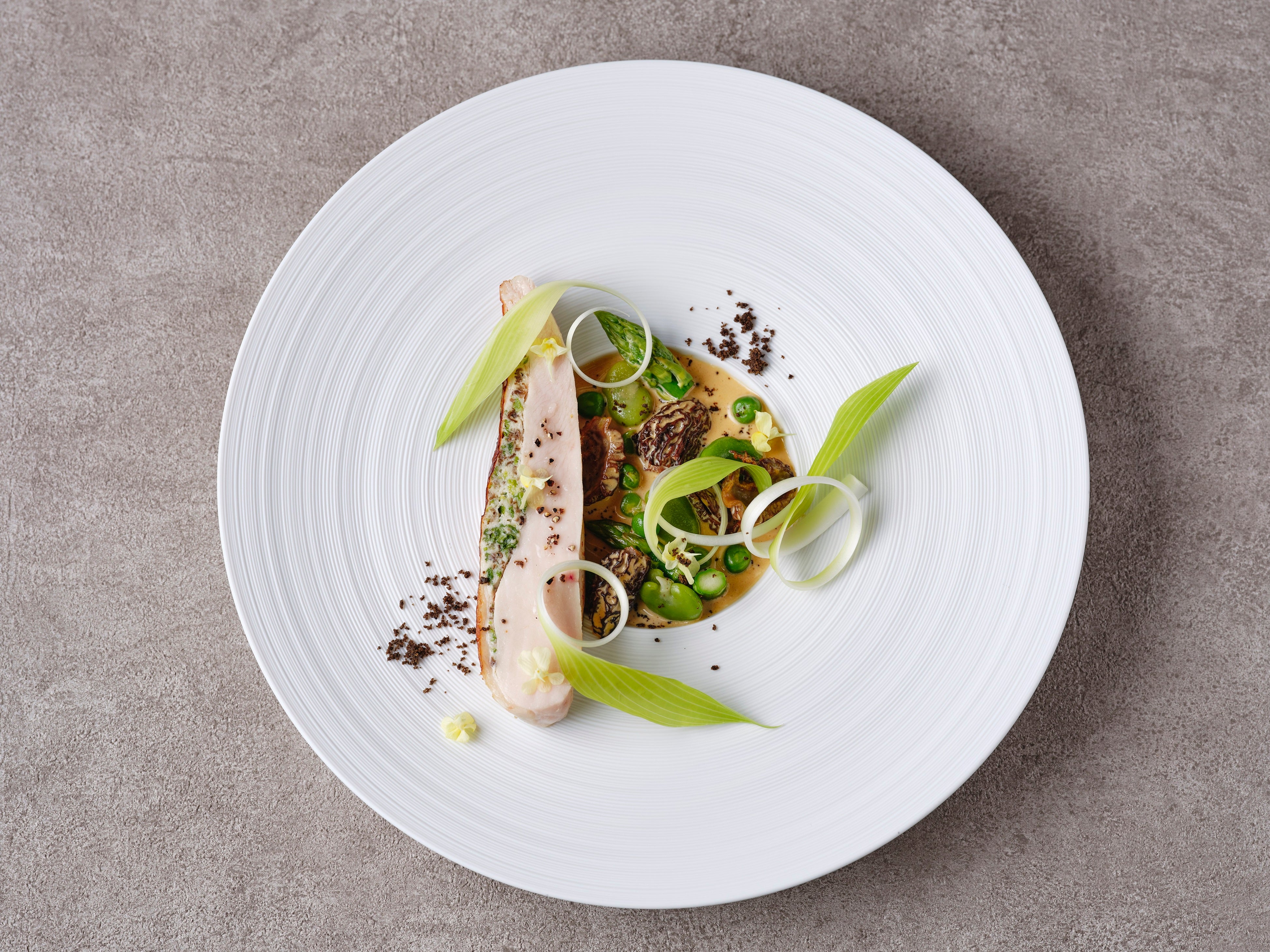 旬のモリーユ茸、菜の花を入れた鶏のムースを丹波地鶏胸肉に挟み込みロースト。鶏の出汁からとった濃厚なシュプレームソースにモリーユ茸の香りを加えた風味豊かなソースとともにどうぞ。