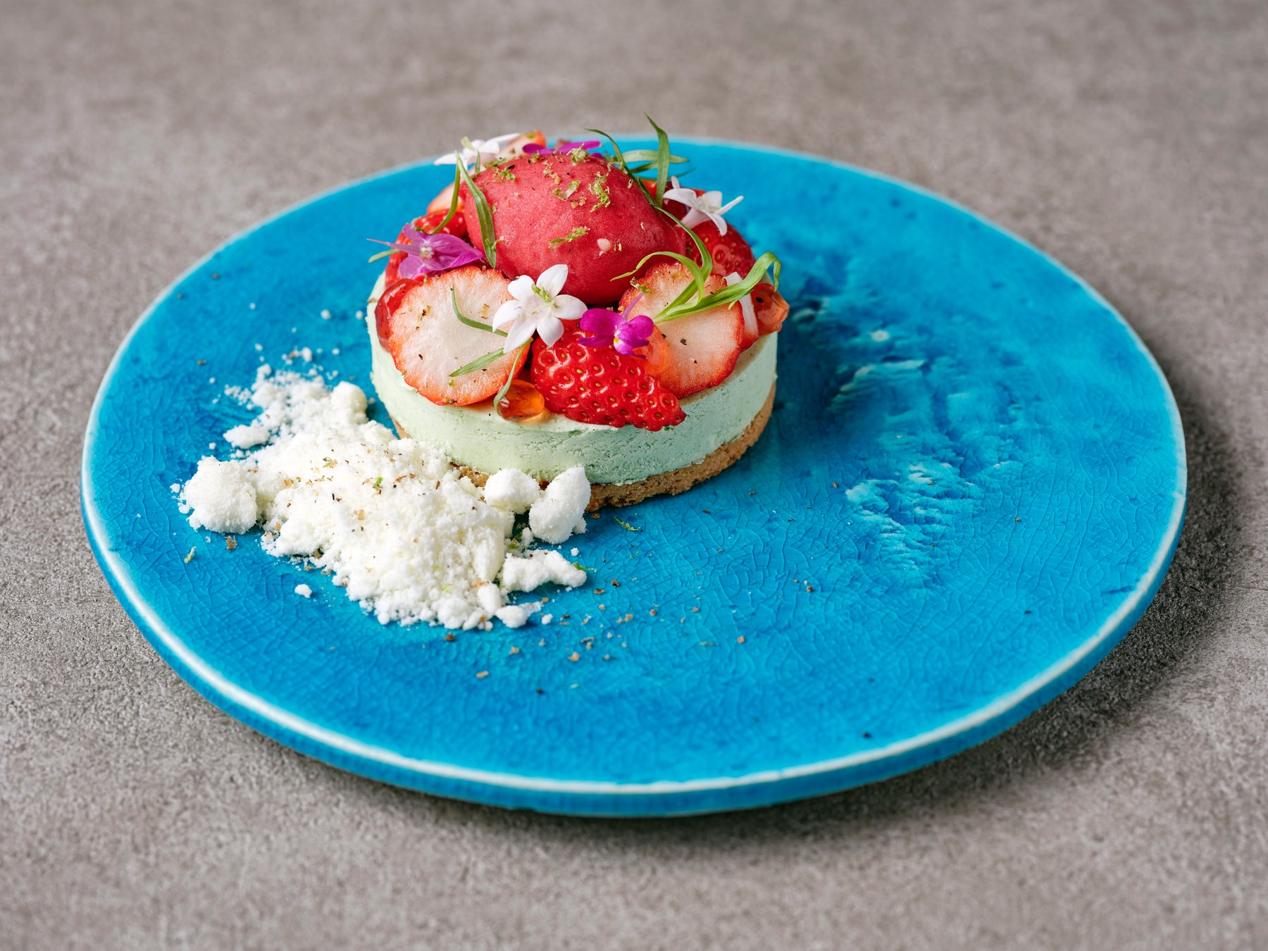 とちおとめ苺を使用した春らしさ溢れる デザート。エストラゴンのパルフェグラスに、苺のコンポート、苺のソルベ、フレッ シュ苺を重ね、モッツァレラチーズのパウダーを添えた華やかな一皿。