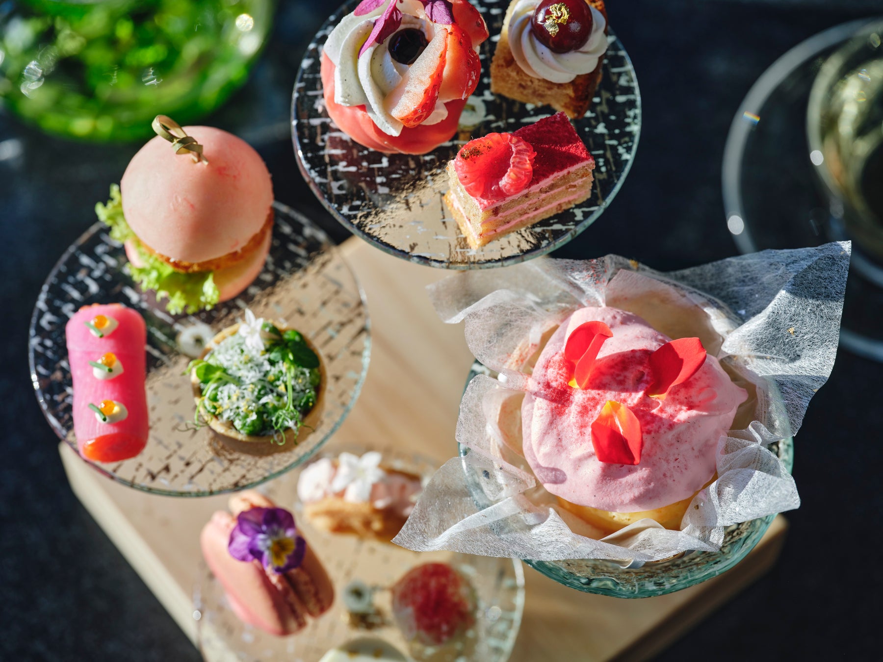レストラン「TENJIN」がお贈りする春のアフタヌーンティーでは、苺やフランボワーズ、グリオットチェリーなどのベリー類や香り高いローズで春色に仕立てたスイーツに加え、菜の花やグリンピースといった季節の食材を使用したセイボリーやスコーンが並び、華やかなティータイムを演出します。