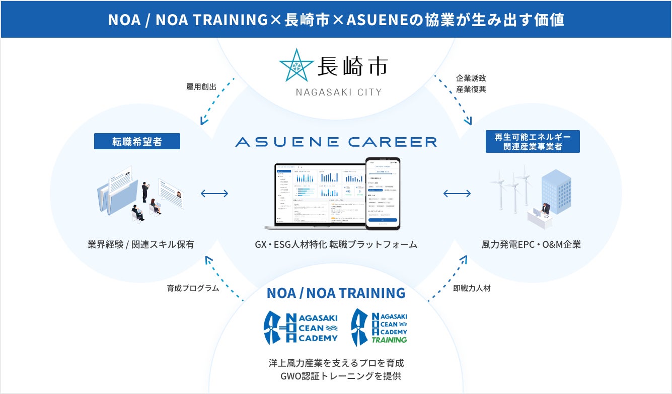 3社は、長崎市の脱炭素社会の実現に向け、洋上風力発電などの再生可能エネルギー領域を含む分野で連携します。また、GX・ESG人材特化型転職プラットフォーム「ASUENE CAREER(アスエネキャリア)」を活用した最適なGX人材マッチングと人材育成を通じて、長崎市の産業の振興および雇用の創出を目指します。