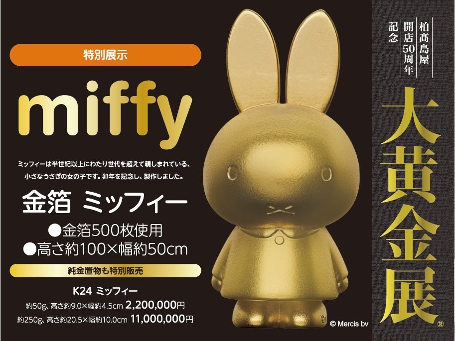 半世紀以上にわたり世代を超えて親しまれている小さなうさぎの女の子、『ミッフィー』との豪華コラボレーション。高さ約1mで金箔を約500枚使用した黄金の像を特別展示いたします。今年の干支の「卯」と縁起もよく、ミッフィーのかわいらしさを黄金で一層華やかに再現しています。