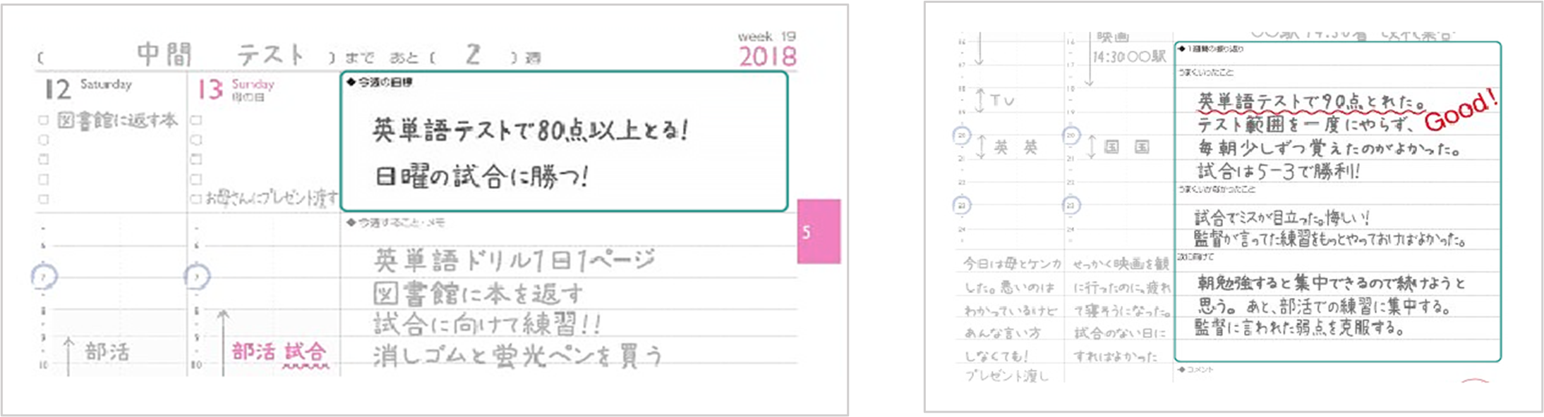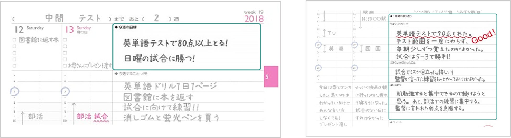 1週間の目標を記入する欄・振り返りを記入する欄があり、1週間ごとにPDCAを回しやすいレイアウト