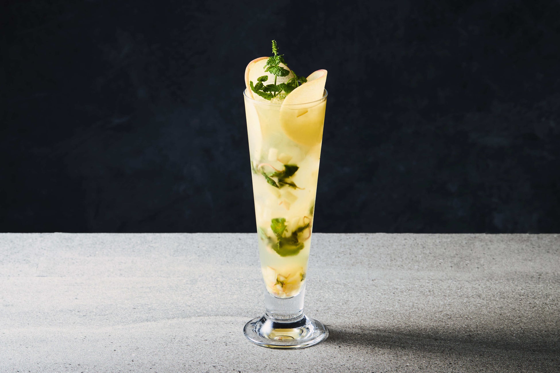 地球環境に優しいサステナブルな製法にこだわったラム「フロール・デ・カーニャ12年」が主役のモヒート。シナモンを漬け込んだスパイスラムにダイスカットしたリンゴを合わせました。コクのあるラムの甘い香りと、飾りに添えたリンゴのスライスの優しい甘味が調和します。なお、モヒートには自社栽培のアップルミントを使用しています。