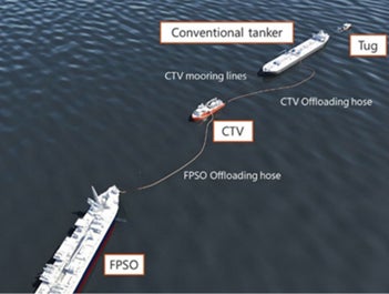 (註1) Cargo Transfer Vessel は、タンカーが波や風で揺れてしまう海域において、FPSOとタンカーの間に接続することでFPSOからタンカーへの原油の積み出しを可能とし、シャトルタンカーを介した積み出しに比べ、原油の物流効率を格段に上げます。現在、CTVは世界に2隻しかなく、SeaLoading社が全船保有し、CTV技術の特許を有しています。