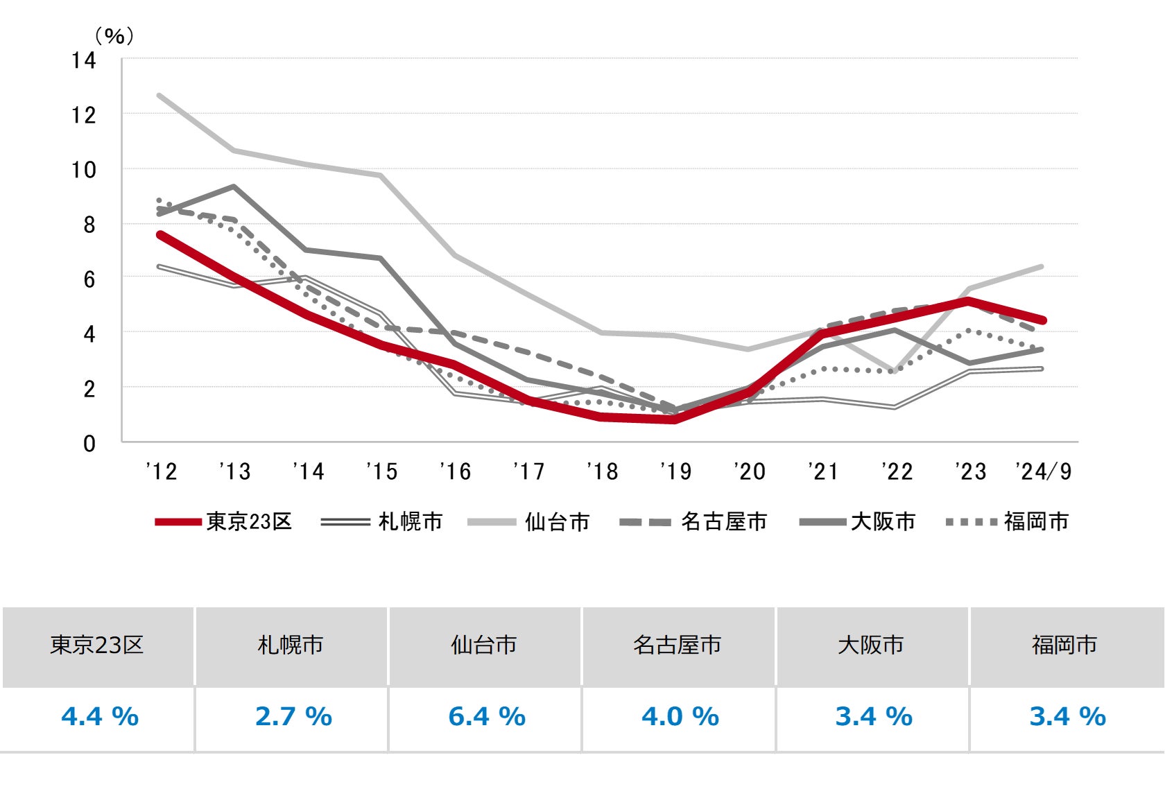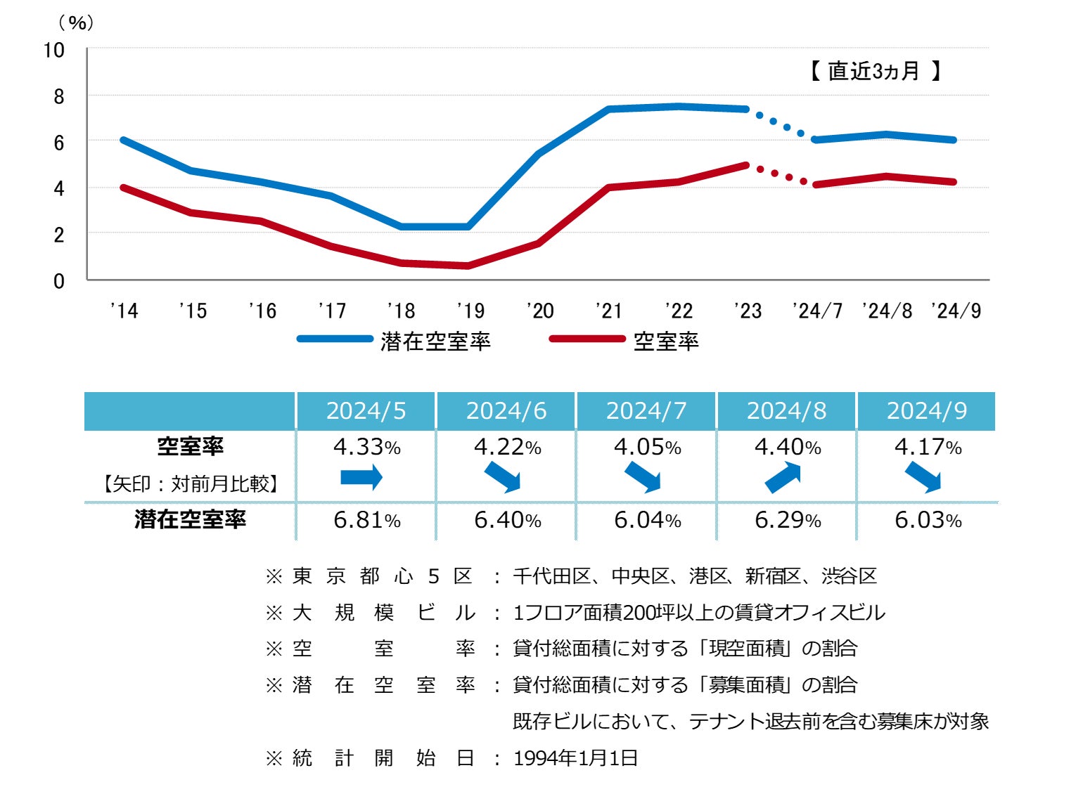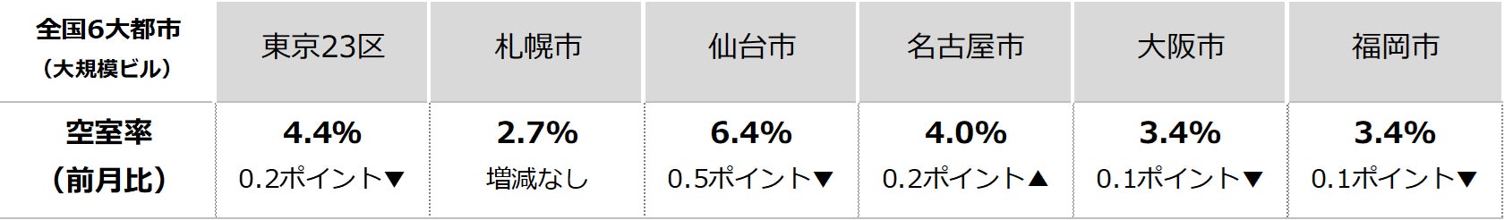 三幸エステート株式会社(本社:東京都中央区、取締役社長:武井重夫)は、2024年9月度の東京都心5区(千代田区、中央区、港区、新宿区、渋谷区)および全国6大都市(東京、札幌、仙台、名古屋、大阪、福岡)の大規模ビル※1のマーケットデータをまとめた「オフィスマーケット2024年10月号」を公表します。
