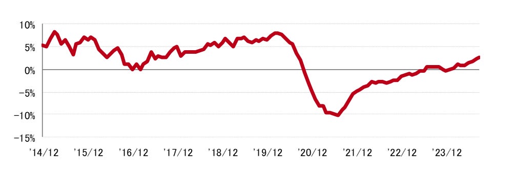 募集賃料の対前年同月比は、2020年10月から2023年6月にかけて33ヵ月連続でマイナスを記録したが、2023年後半には横ばい傾向となり下げ止まりの動きが見られた。2024年2月からは8ヵ月連続でプラスとなり、募集賃料は緩やかながらも上昇傾向に転じている。