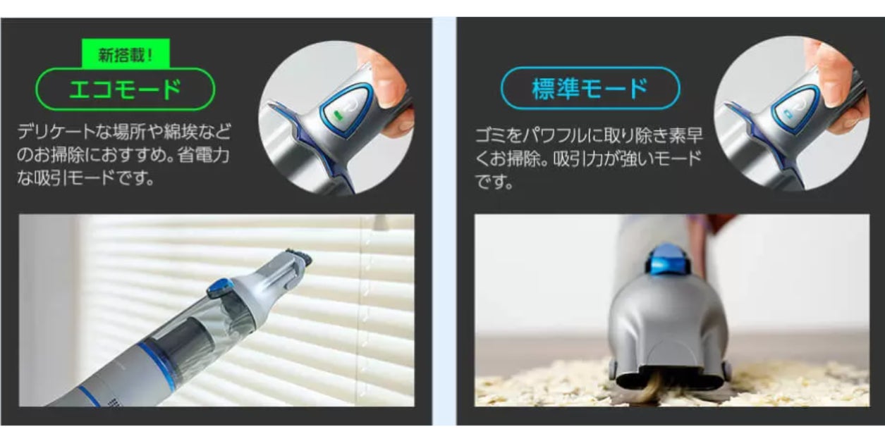 超軽量はそのままに、初リニューアル!エコモードを搭載し連続使用時間が長く、吸引力も長持ちして新登場