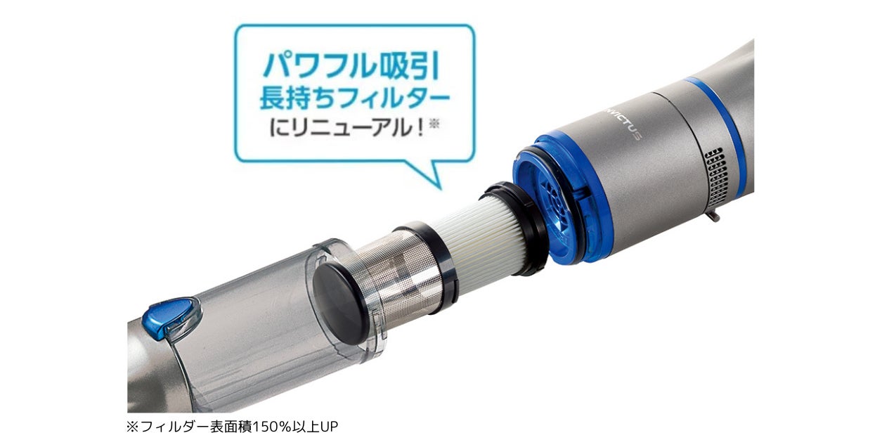 HEPAフィルターの表面積を150%以上UPし、目詰まりしづらくなり、吸引力がさらに長持ちするように。お手入れの頻度の削減にも繋がります。