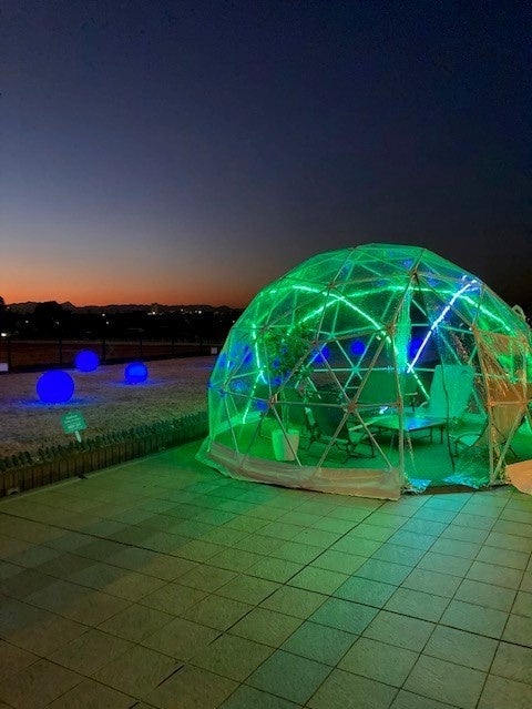 フジミテラスでは、大型のドームテントを1台を追加して計3台に、さらに人工芝装飾を施したベンチを新たに設置します。当スペースではテイクアウトした食事も可能です。