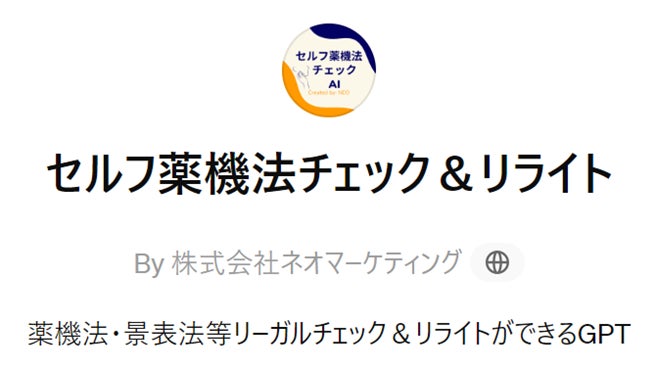 このような状況を踏まえ、ネオマーケティングは約8年間のチェックデータを教師データとした「セルフ薬機法チェック&リライトGPTs版」を、OpenAI社が運営するGPT Storeに提供を開始しました。
