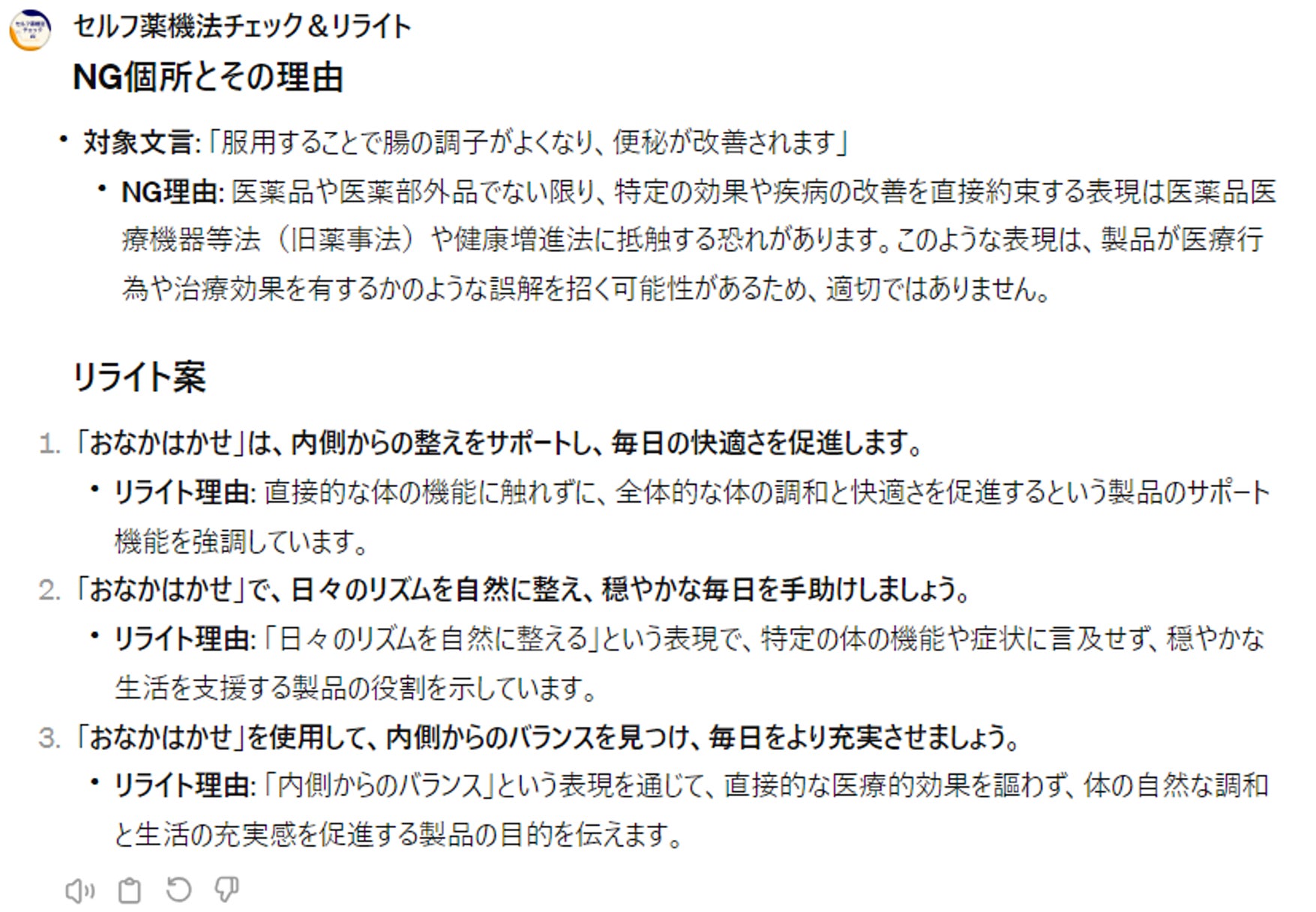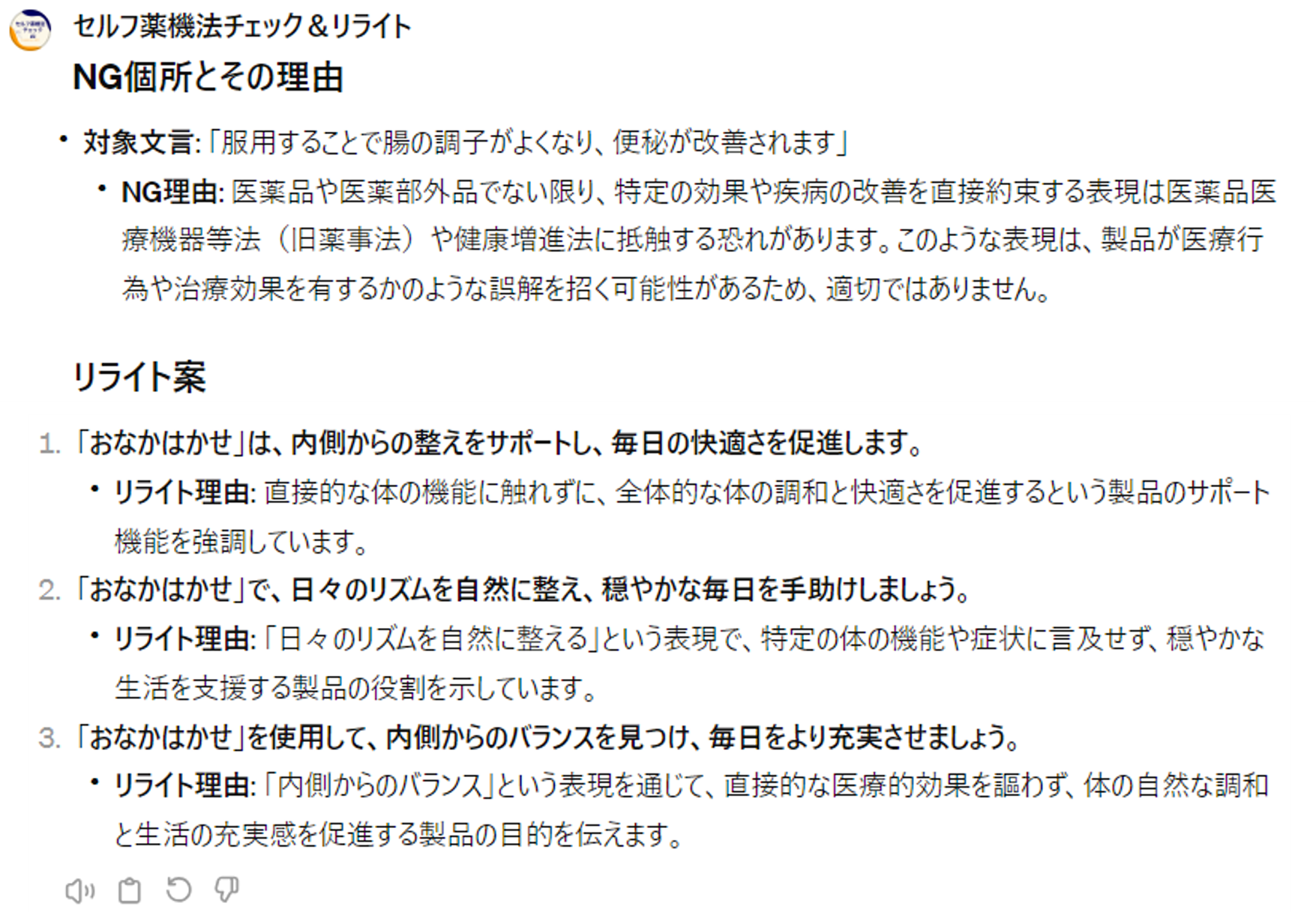 すでにいくつかの薬機法AIチェックサービスが存在していますが、本サービスが独自の特長を持っている点は、不適切な表現に対するリライトの提案やNGと判断される理由を回答として提供することです。