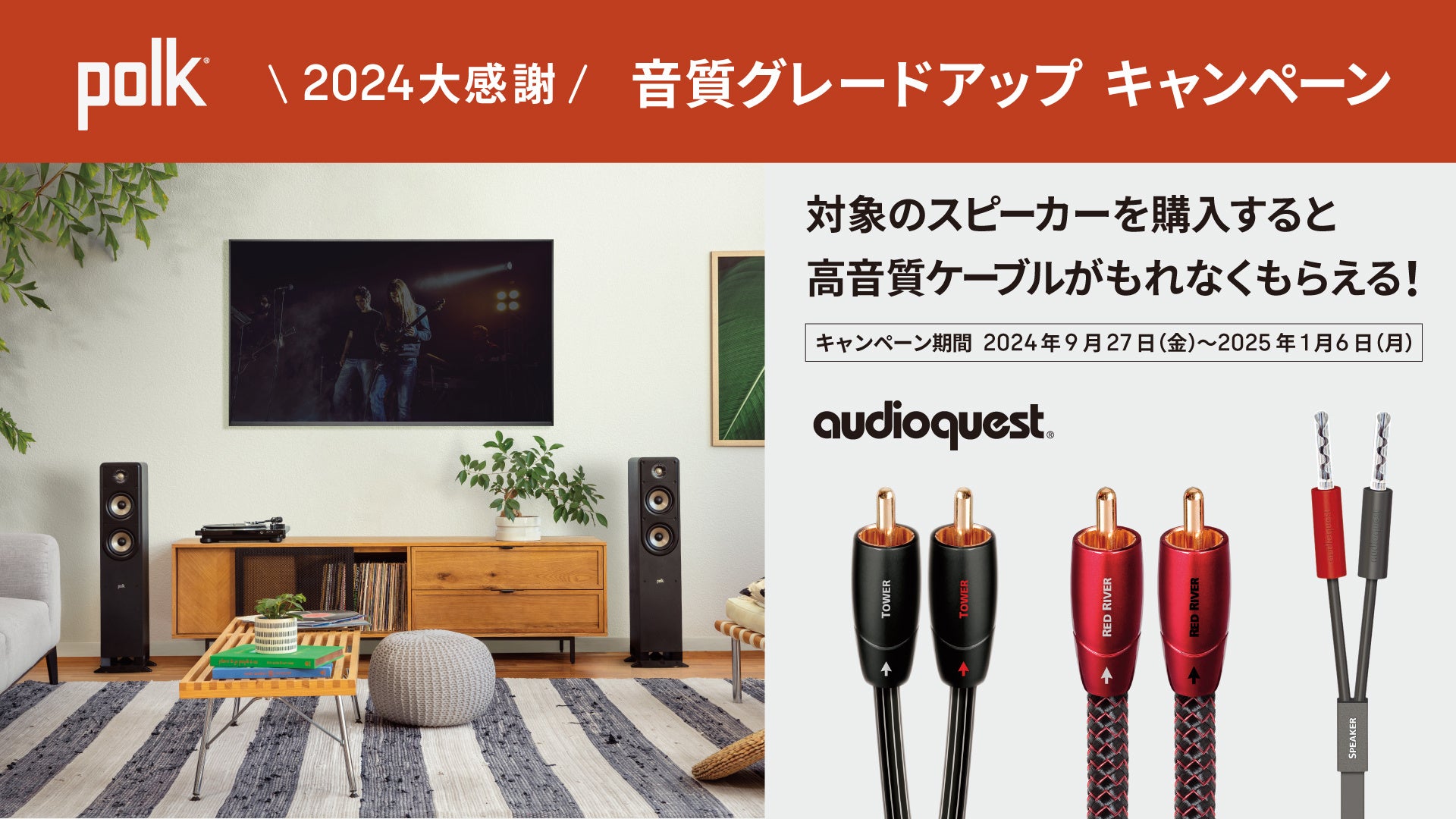 Polk Audioは本年も日本の皆様に予測を大きく超える特別なご愛顧をいただきました。そのお気持ちに感謝し、2024年9月27日(金)より「2024大感謝 高音質ケーブルプレゼントキャンペーン」を実施いたします。