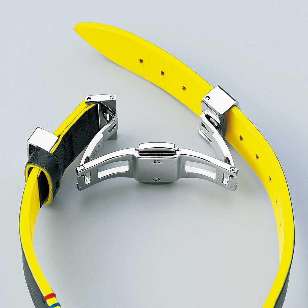 牛革ベルトの裏面黄色部分は、汗ムレを軽減し、素材が傷みにくい柔らかなシリコン素材を使用。