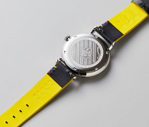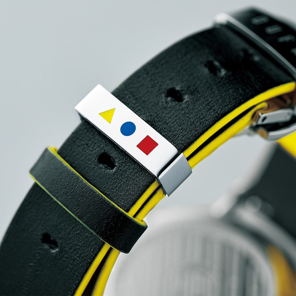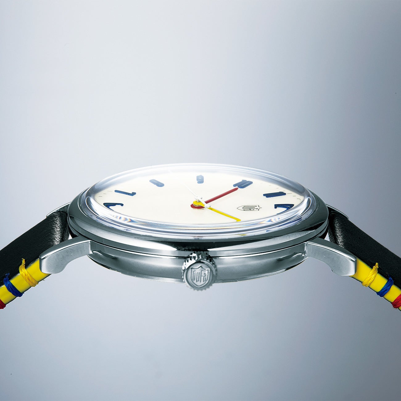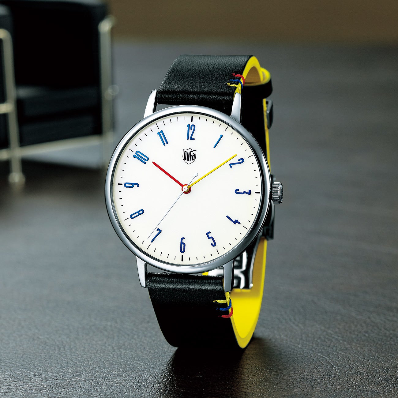 ご紹介するのは、当社が特別に制作を依頼した、〈ドゥッファ〉初となるソーラーウォッチです。ソーラーパネルが内蔵されていることを感じさせない乳白色の文字盤は、ブランドロゴ以外の装飾を削ぎ落としたモダンなデザイン。バウハウスが提唱する色の三原色「黄・青・赤」を時針や分針、インデックスに取り入れ、シンプルで機能的な美しさを表現しています。