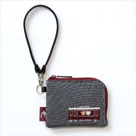 デニムバッグとお揃いのブラックの平デニム生地と「マルーンカラー」のデザインで、阪急電車に乗っておでかけするクマちゃんたちのワンポイント刺繍が入ったパスケース。コインケース付きで、小銭入れや小物入れとしても活躍します。