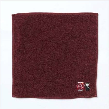 阪急電車と駅長さんのクマちゃんのワンポイント刺繍がかわいらしい、阪急電車をイメージした「マルーンカラー」の今治産のタオルハンカチ。
