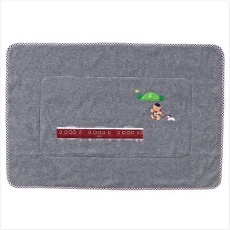 錨山を背に神戸を駆け抜ける阪急電車とおでかけするクマちゃんたちがアップリケと刺繍でデザインされた、ご自宅やオフィスで大活躍するブランケット。