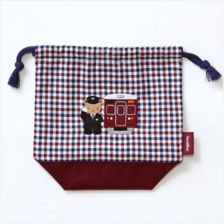 阪急電車をイメージした「マルーンカラー」とコラボレーション限定の“マルーン&ネイビー”のチェック柄を組み合わせた巾着。
