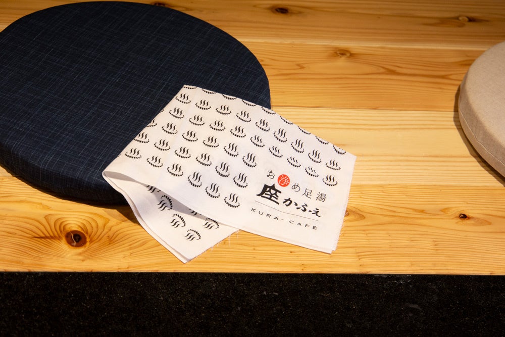 足湯上がりに足を拭く、座-KURA-かふぇオリジナル手拭いもプレゼント。カップルやご夫婦、観光の合間の方も、どうぞお気軽にお立ち寄りください。