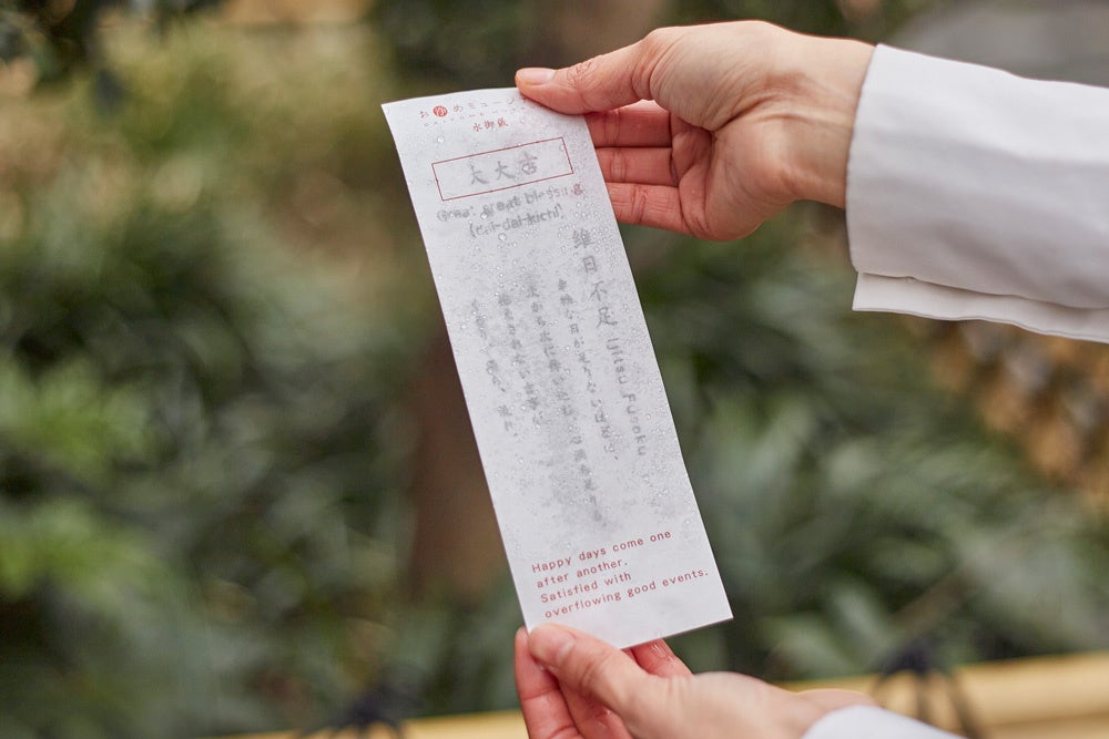 水に浸すと文字が浮かび上がる水御籤を引いてその日の運試しを。旅の思い出作りにもぴったりです。