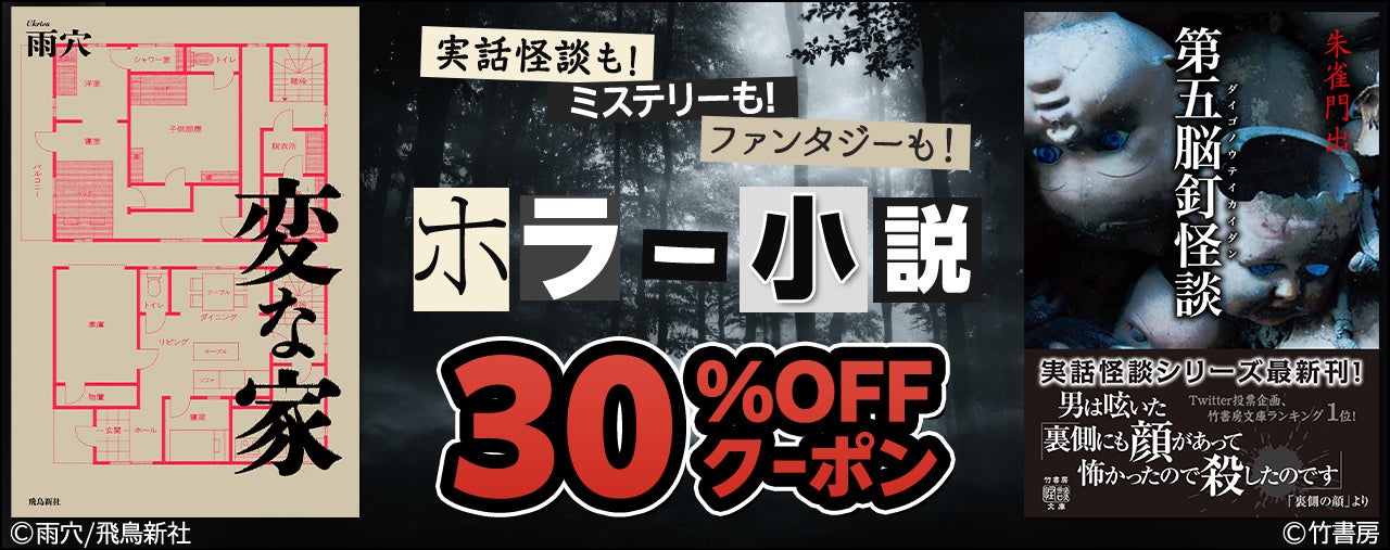 2024年春に映画公開決定!大反響のベストセラー不動産ミステリー『変な家』や、日常の隙間の不可解を覗き込む伝説の実話怪談シリーズ『第五脳釘怪談』など、夏に読みたい「ホラー小説」を特集いたします。また、約200冊の対象作品に使える30%OFFクーポンも配布。怖くても面白い、読み出すと止まらない! 暑さが続くこの時期は、背筋が凍るホラー小説の世界にぜひ浸ってください。