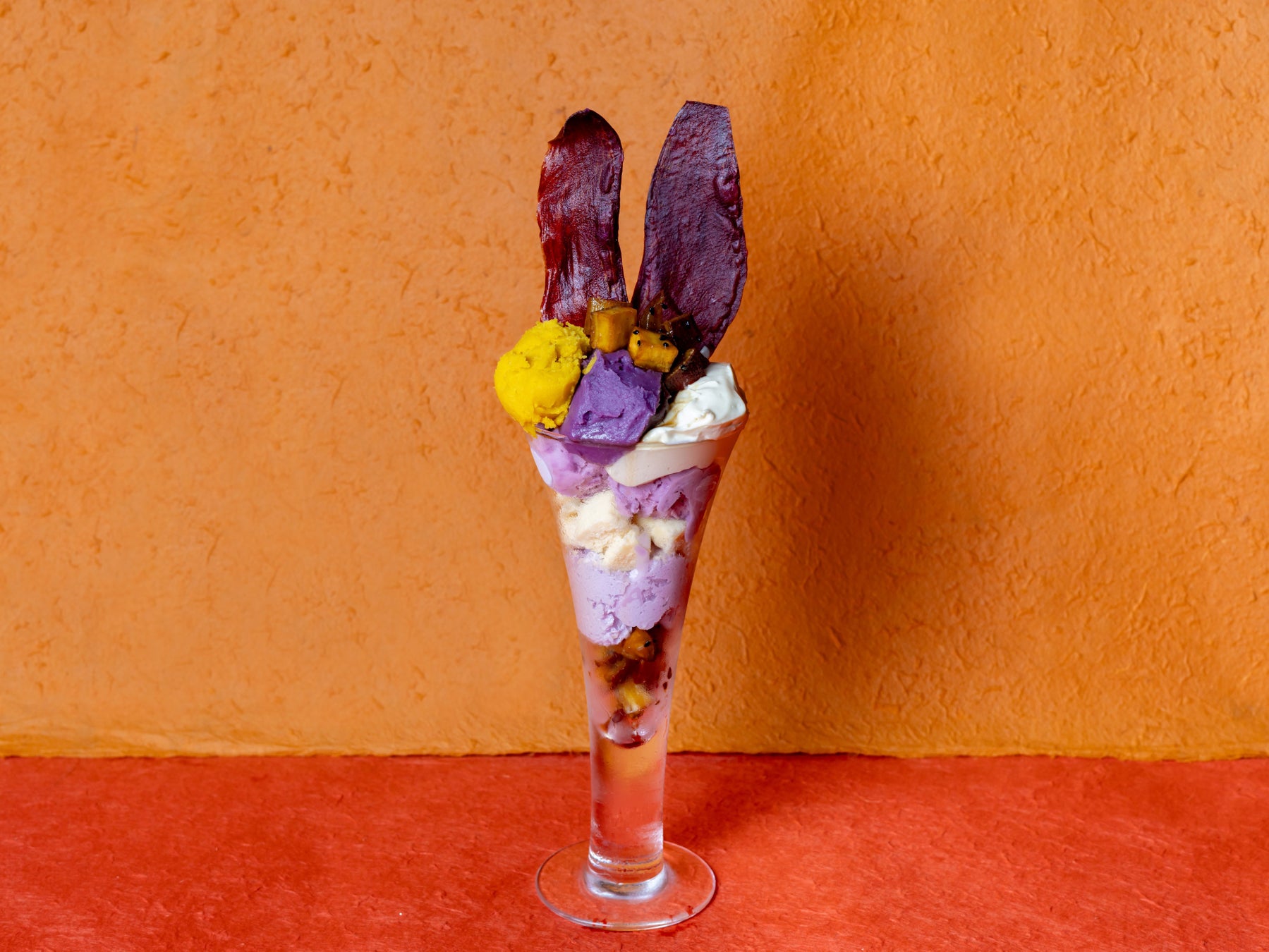 島豆腐、紅芋、さつまいもなど沖縄らしく、また秋の旬も楽しめる素材を使い、アイス、チップス、大学芋、クリームといった多彩なかたちで表現。ほのかに塩味を感じる島豆腐と、紅芋やさつまいもの自然な甘みが重なり合い、ひと口ごとに異なる味わいと食感のハーモニーが楽しめる、新感覚のパフェに仕上げました。