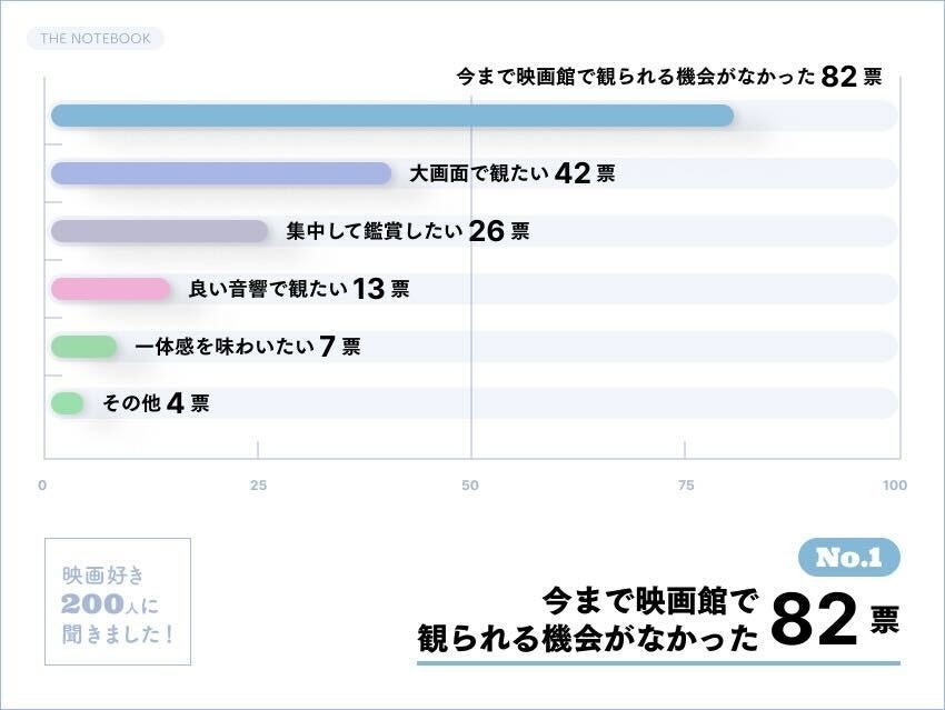 映画館で鑑賞したい理由は「今まで映画館で観られる機会がなかった」が82票で第1位となりました。レンタルや配信での鑑賞が多く、映画館では観たことのないユーザーが多くいたようです。また、「大画面で観たい」「集中して鑑賞したい」など、映画館ならではの鑑賞体験を楽しみたいユーザーも多いことがわかりました。