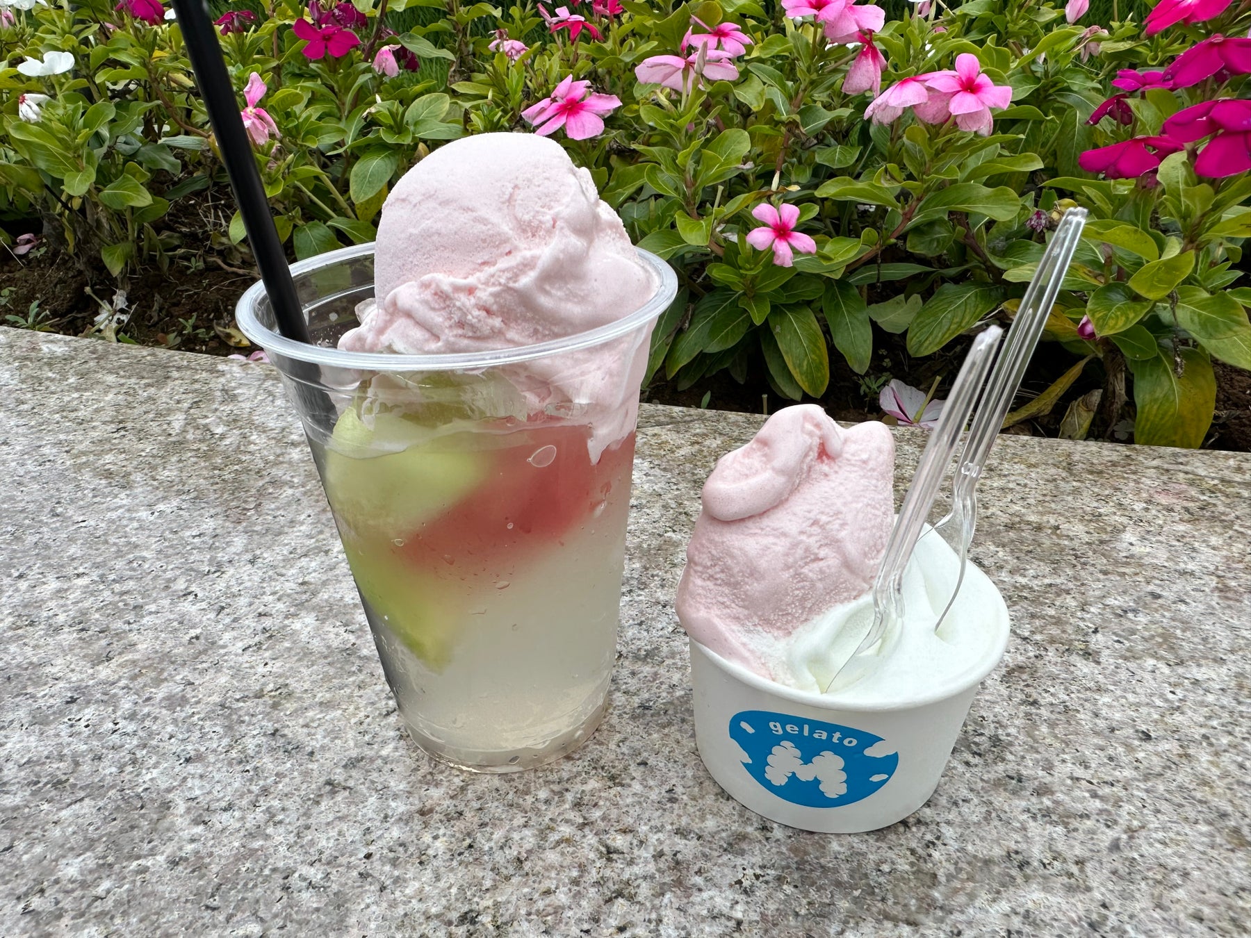 同日に開催した阿見町の観光物産展「初夏のまい・あみ・マルシェ」に出店のジューススタンドが扱う、茨城県産の「スイカジュース」、「メロンジュース」をそれぞれ試飲いただきました。
