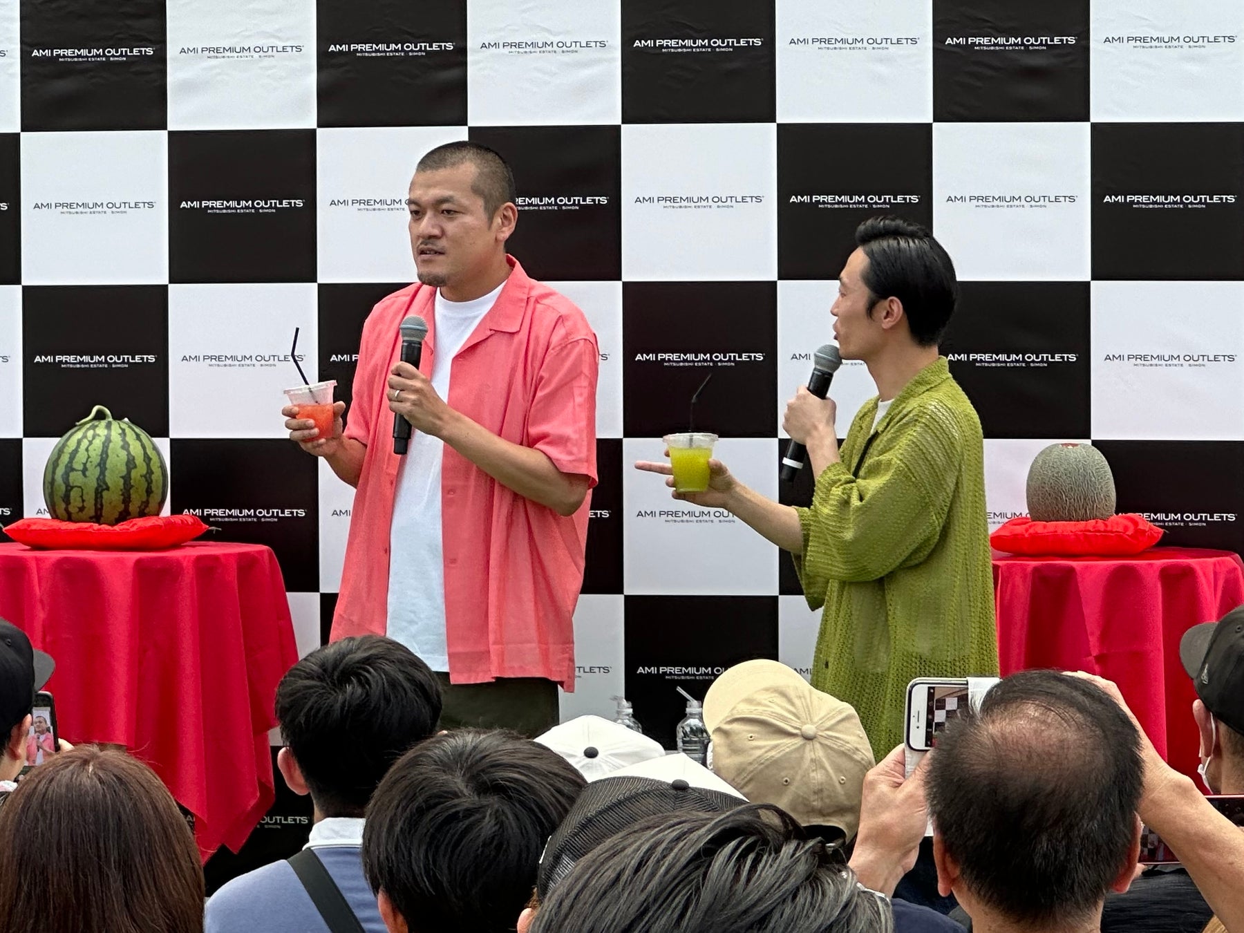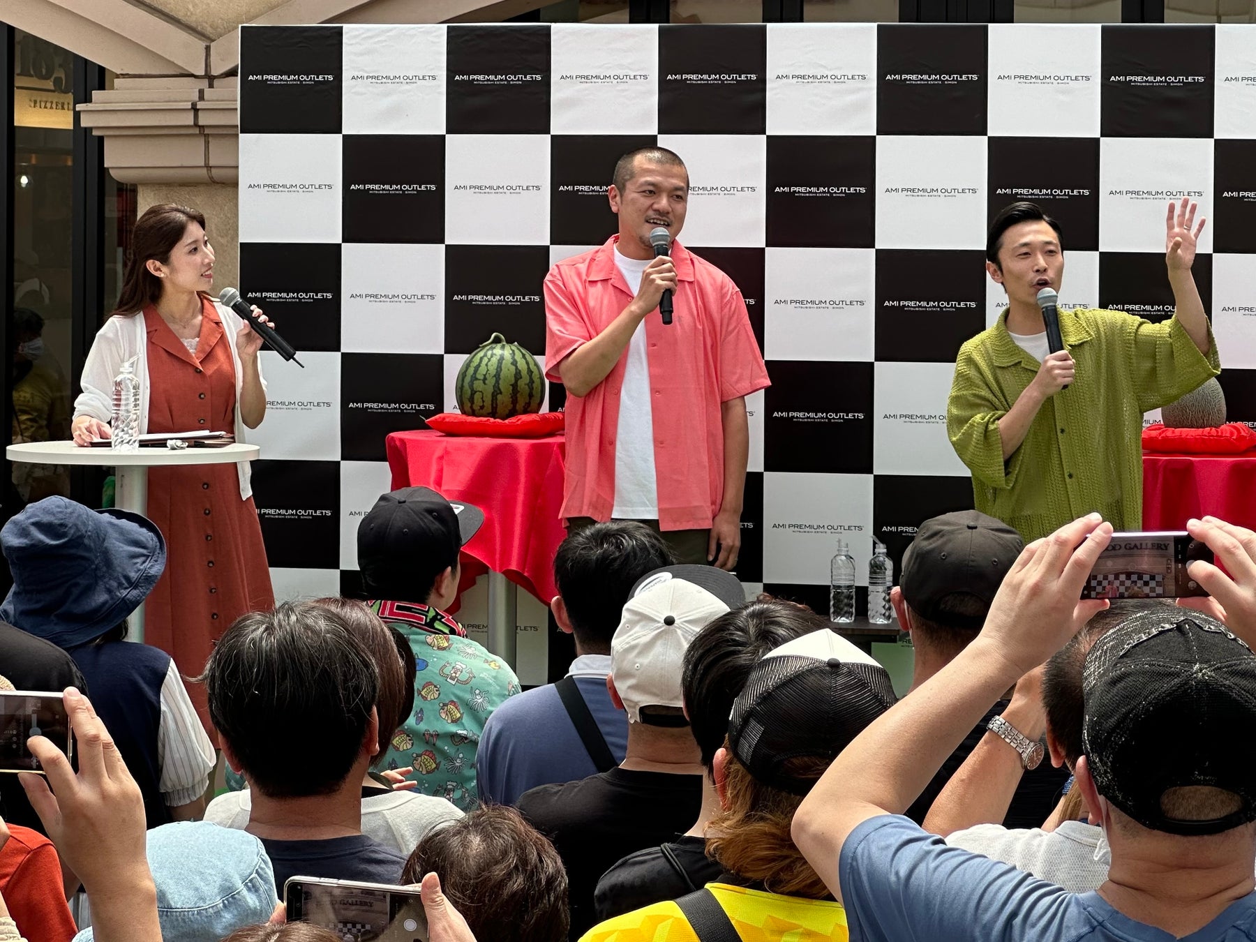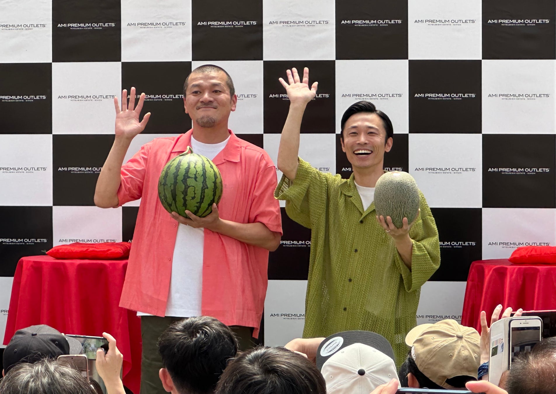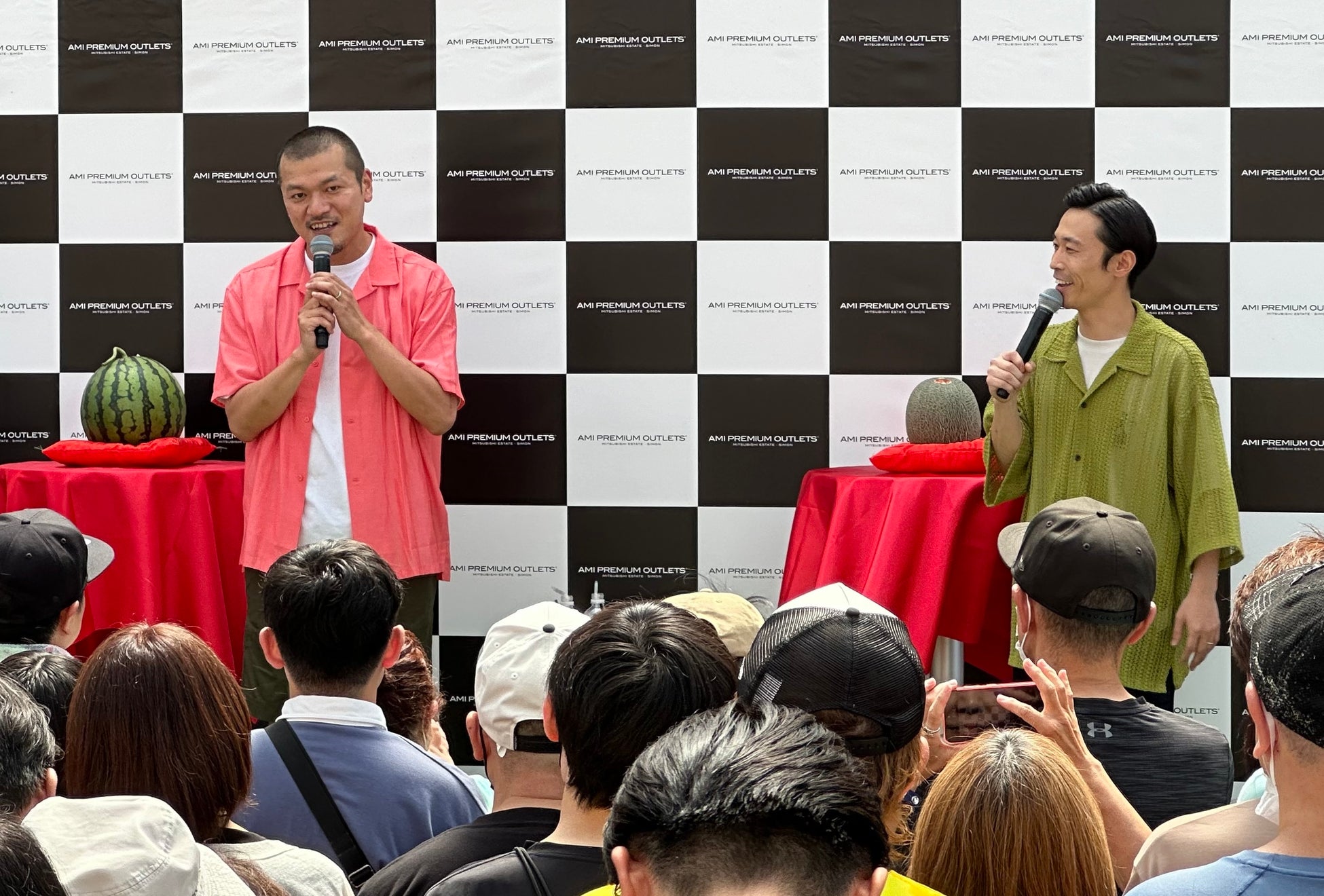 あみプレミアム・アウトレット(所在地:茨城県稲敷郡阿見町、運営:三菱地所・サイモン株式会社)は、2024年7月に開業15周年を迎えます。これを記念し、6月29日(土)に、地元特産の旬のフルーツをテーマとした、茨城県出身のお笑いコンビ「カミナリ」によるトークイベント「メロン VS スイカ対決」を開催しました。約500名と多くのお客様が観覧する中、「カミナリ」のお二人が軽快なトークを繰り広げ、会場は賑やかな笑いに包まれました。