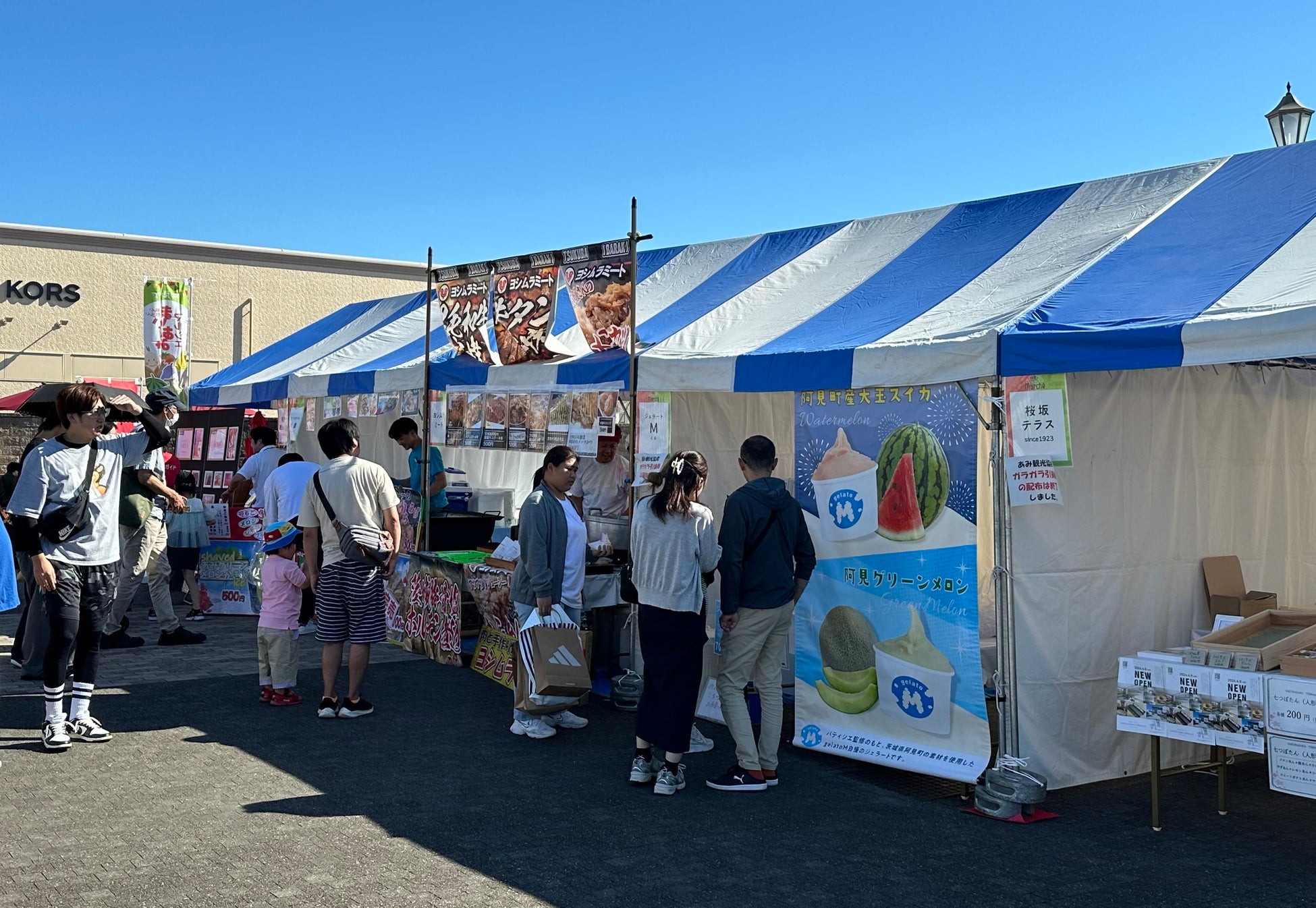 当日は、あみ観光協会による「初夏のまい・あみ・マルシェ」もあみプレミアム・アウトレットで開催し、阿見町産の「大玉スイカ」や、「あみグリーンメロン」のほか、ジェラートやジュース、阿見町産のレンコンを使ったグルメなどを販売し、トークイベントと連動して阿見町の魅力を発信しました。