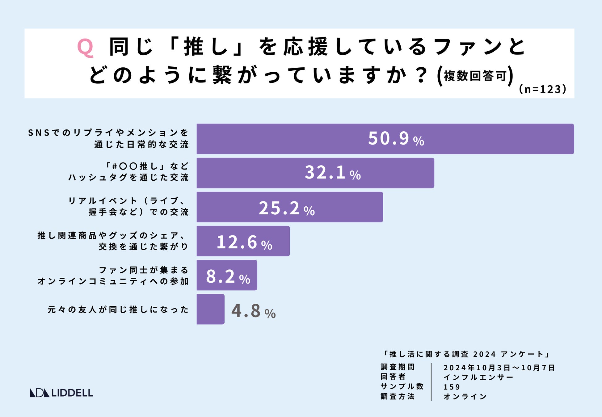 またどのようにファン同士が繋がっているかという質問には 50.9%が「SNSでのリプライやメンションを通じた日常的な交流」をしていると回答しました。