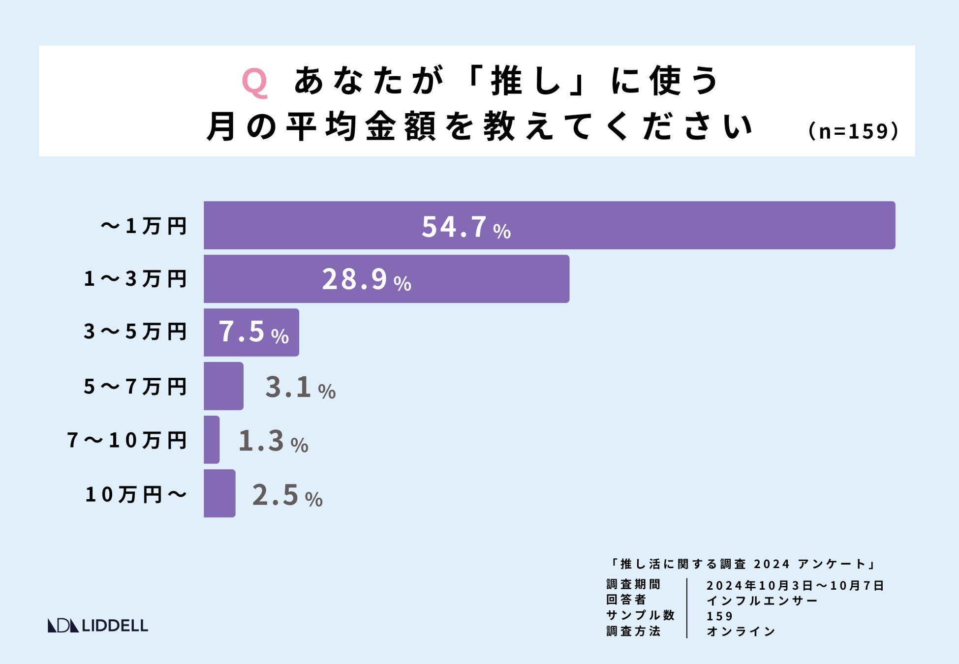 54.7%が月間支出を1万円以下と回答。次に多かったのが1〜3万円で 28.9%の回答を集めました。また2.5%が毎月10万円以上を推し活に使うと回答しています。