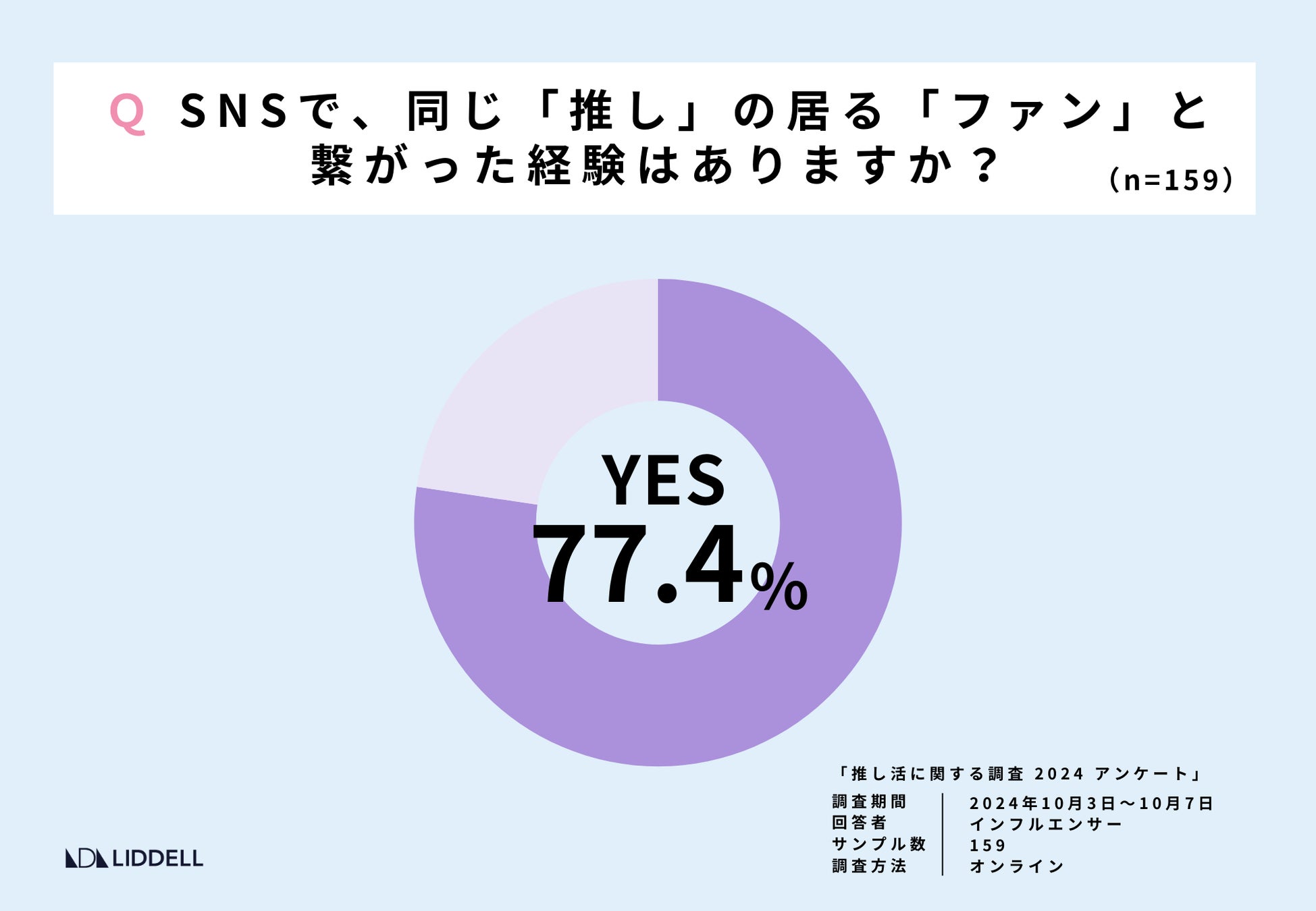 SNSで同じ「推し」の居る「ファン」と繋がった経験があるかという質問には 77.4%が「YES」と回答。