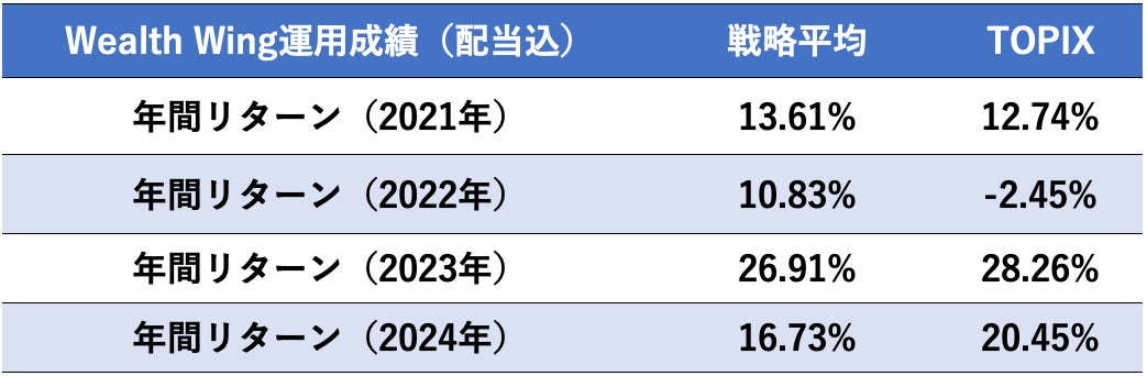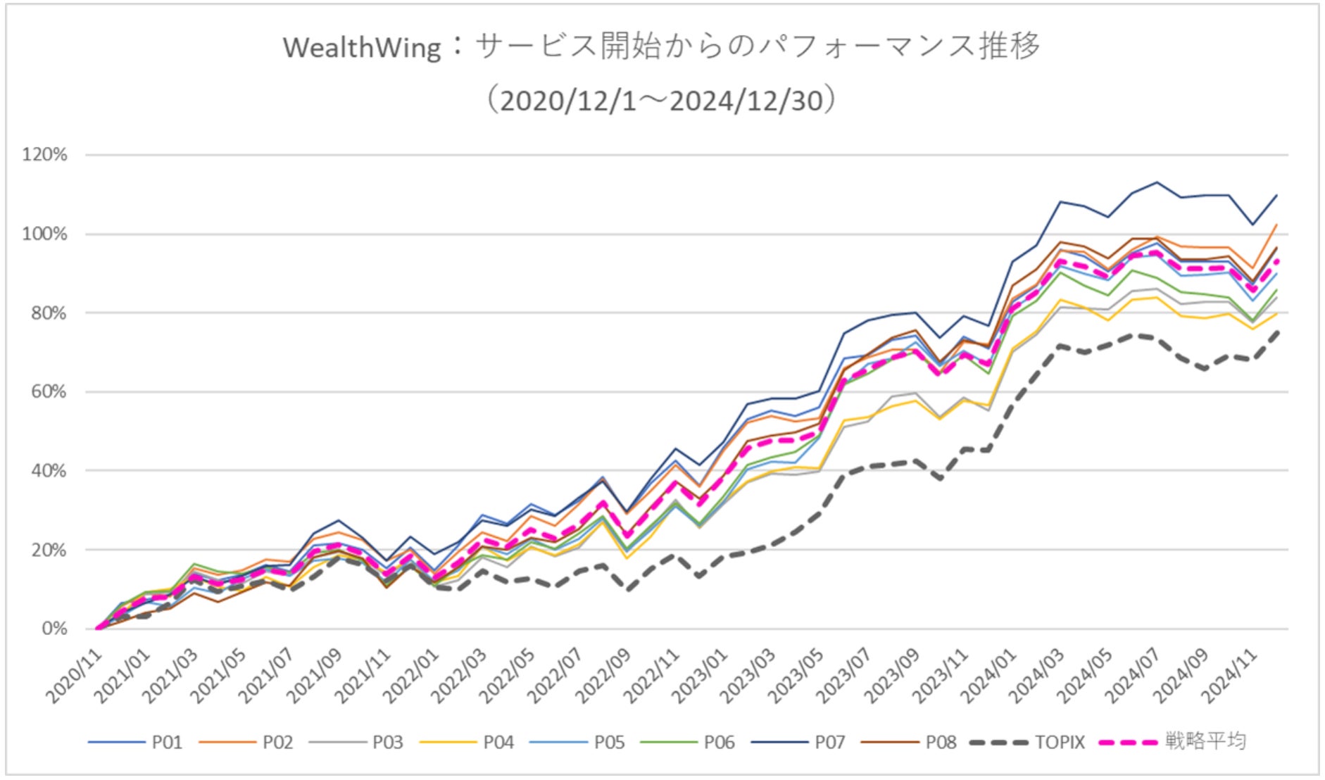 次世代金融インフラの提供を通して組込型金融を実現し、金融がもっと暮らしに寄り添う世の中を創るFinatextグループの証券会社、株式会社スマートプラス(本社:東京都千代田区、代表取締役:小林 紀子、以下「当社」)が提供する、日本株おまかせ投資サービス「Wealth Wing(ウェルスウイング)」にて、2024年12月の運用結果が最も良かった戦略は日本株市場(東証株価指数、以下「TOPIX(配当込み)」)を1.69%上回りました。