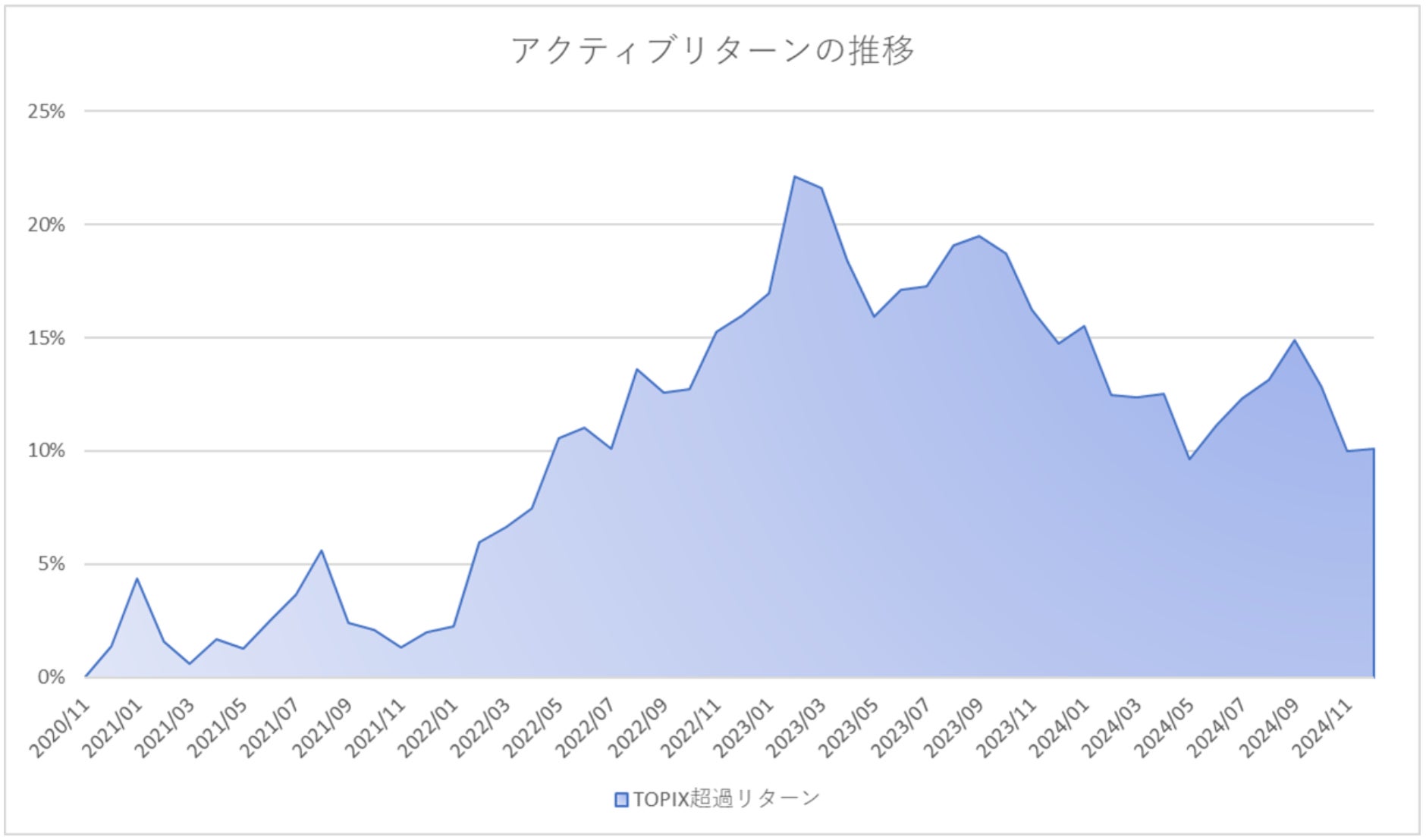 2024年12月にWealth Wingで最も月間成績が良かった戦略は、「バランス型高収益高成長ポートフォリオ」でした。月間で+5.71%、対TOPIX比では+1.69%となり、TOPIX(配当込み)を大幅にアウトパフォームしました。