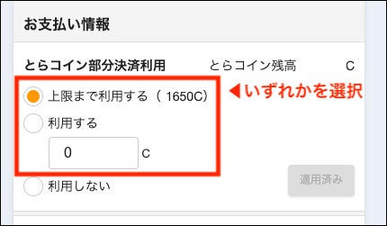 →「注文内容確認画面」のお支払い情報の設定欄に、「とらコイン部分決済利用」という項目が表示されます。「上限まで利用する」もしくは「利用する」を選択して「適用する」をクリックしてください。