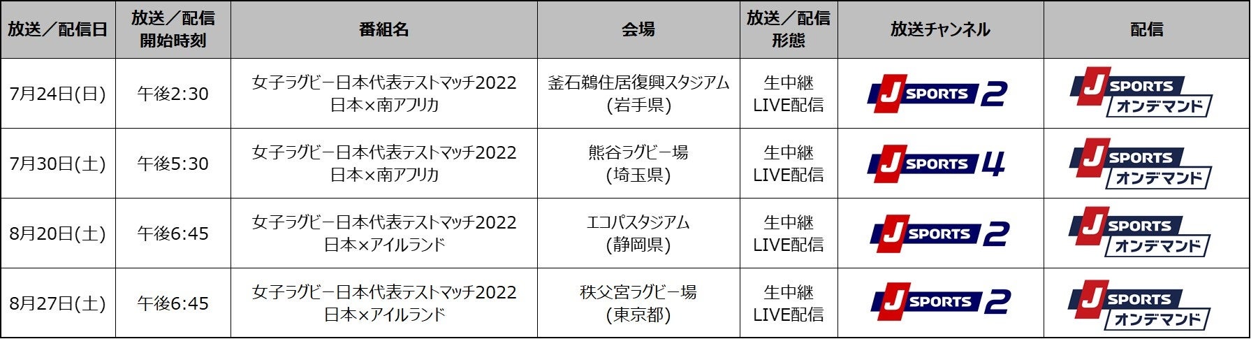 国内最大4チャンネルのスポーツテレビ局、株式会社ジェイ・スポーツ(本社 東京都江東区、代表取締役社長 長谷 一郎、以下「J SPORTS」 ※1)は、 7月に南アフリカ代表、8月にアイルランド代表を日本国内に招いて行う 「女子ラグビー日本代表テストマッチ2022」 全4試合を生中継いたします。 また、PC、スマホ、タブレットで見られる動画配信サービス 「J SPORTS オンデマンド 」 ※2 でも LIVE 配信いたします 。