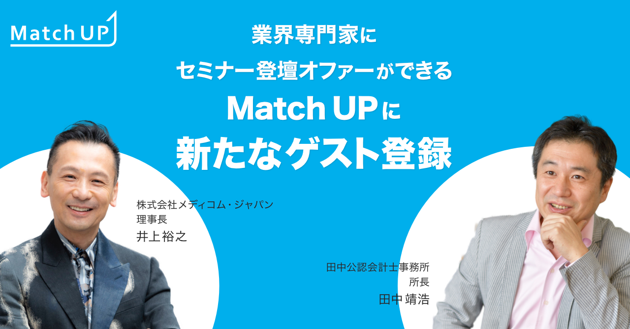 業界専門家にセミナー登壇オファーができる「Match UP」株式会社メディコム・ジャパン 井上裕之氏、田中公認会計士事務所 田中靖浩氏が新たにゲスト登録