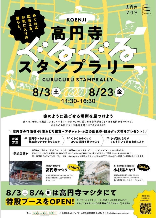 ・内 容:「食べる」「着る」「入浴する」「くつろぐ」など、高円寺には、まるで自分のお家のように過ごせるスポットで溢れています。スタンプラリーを片手にお気に入りの場所を見つけてみませんか。